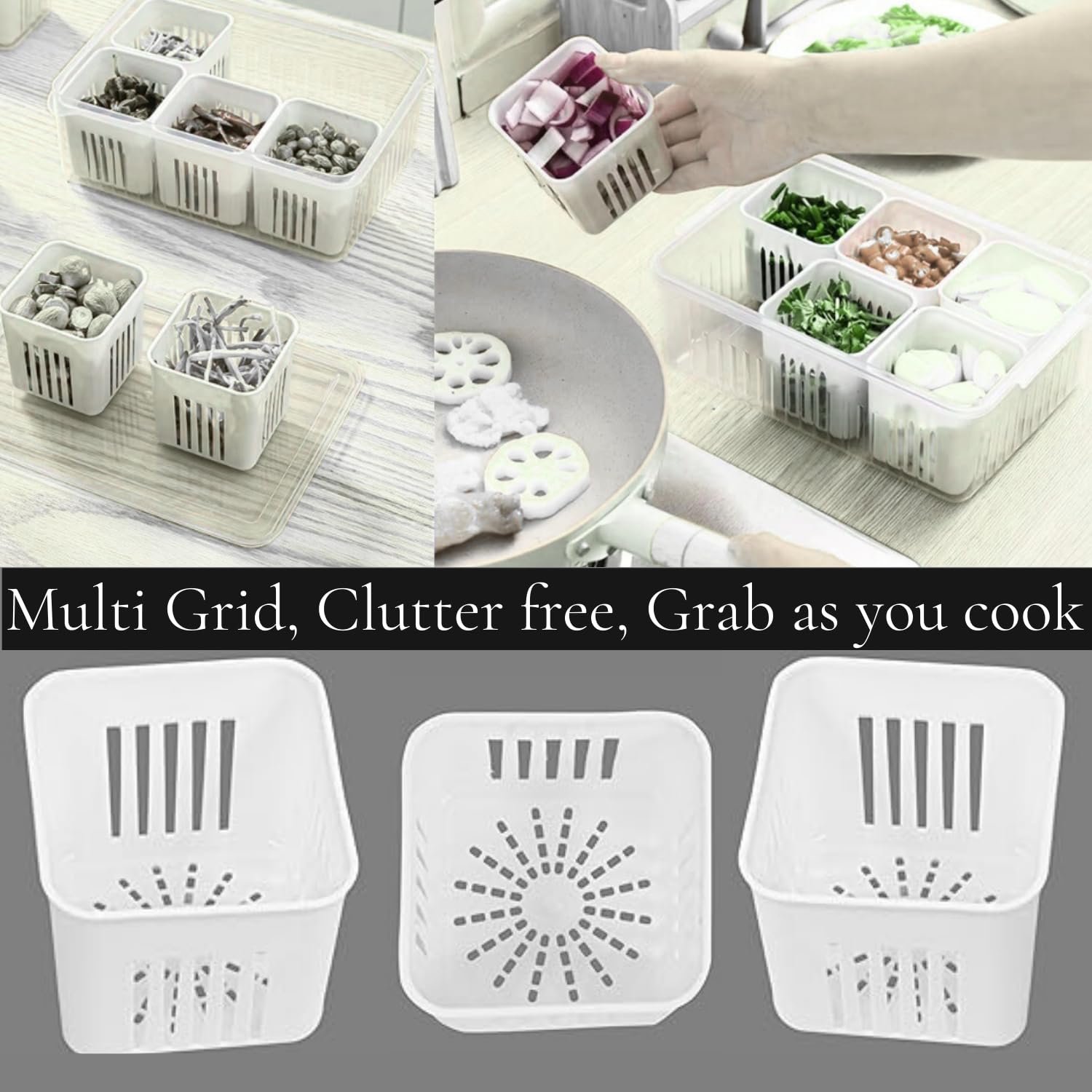 Multi Grid Divider Design: Keeps fruits, vegetables, snacks, and more neatly separated for easy access and storage.