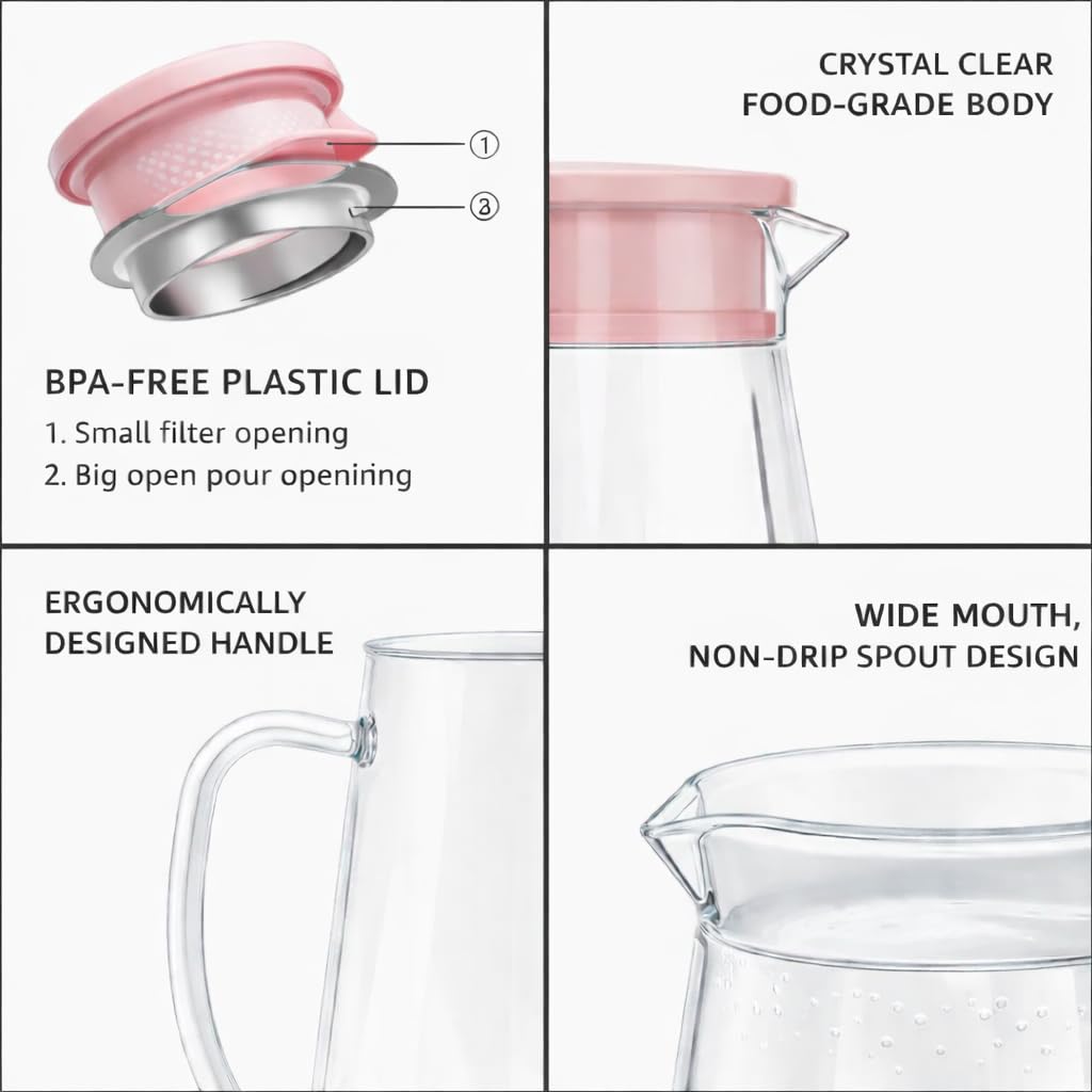 SMART ERGONOMIC BUILD: Designed for daily convenience, the pitcher features a sturdy, comfortable handle that provides a secure grip for pouring. The specially designed V-spout ensures a smooth flow without dripping or spilling, and the removable lid fits snugly to keep your beverages fresh and hygienic in the fridge.