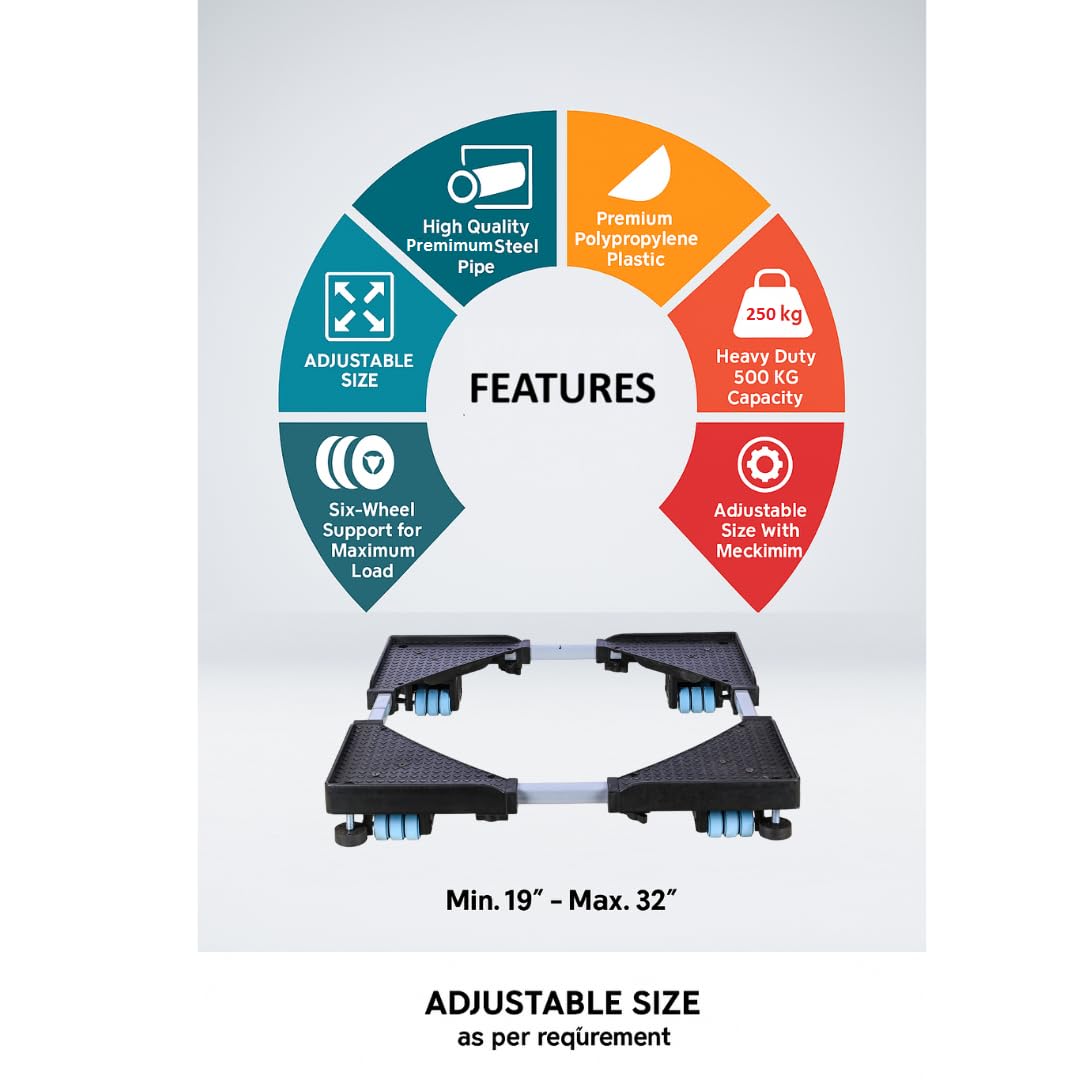 ✅ Features : Adjustable Size: Min – 19 inch x 19 inch | Max – 32 inch x 32 inch | Ultra-Premium Heavy Duty 24 Wheel for Maximum Stability: 500 KG load capacity Highest grade metal | Can support dishwasher, refrigerator & washing machine (fully top load & front load) of all brands, No of Pipes : 4, Please measure your machines size firstly when you order!