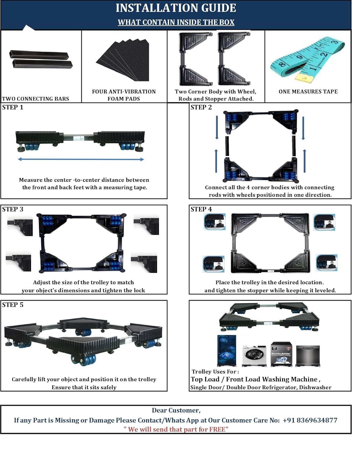 ARROWKEY HEAVY DUTY PREMIUM 24 WHEEL ADJUSTABLE TROLLEY/STAND. SUITABLE FOR FRONT LOAD/ TOP LOAD WASHING MACHINE /HEAVY LOAD REFRIGERATOR/FRIDGE/DISHWASHER/AIR COOLER OTHER MULTIPURPOSE . *ADJUSTABLE BASE SIZE : The base size adjustable. DIMENSION : min 21 in ×21 in ( 53.34 cm ×53.34cm ) max 27 in ×27 in (68.58 cm × 68.58 cm) .Height 3 in. *LARGE WEIGHT CAPACITY: 24 Heavy Duty caster wheel with metal bracket and pp (virgin) plastic corner with 4 adjustable stopper. which can carry upto 250 kg. * APPLICATION: Suitable for all type of brand washing machine 6kg to 16 kg capacity machine .Refrigerator/Fridge starting from 100 ltrs to 450l trs . Dishwasher and Air cooler other home appliances with same