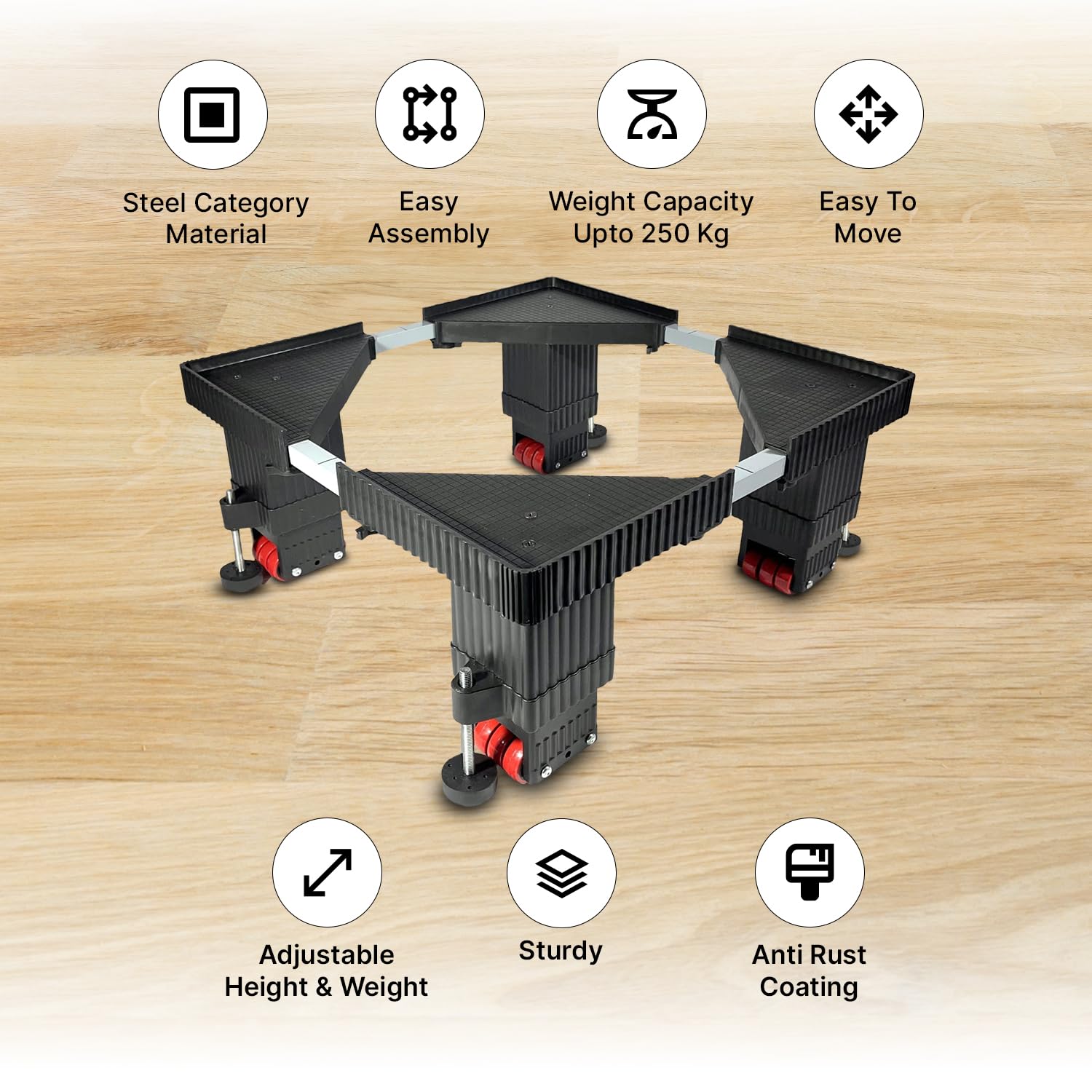 Adjustable Size : The washing machine (Semi Automatic and Fully Automatic) stand base size can be adjustable. Min: 50x43x cm to Max: 76.2×76.2 cm (inner) objects. you can effortlessly move a wide variety of furniture through your house.Universal Wheel : The Movable base is used for the bottom of appliances like portable front load / top load washing machines / Refrigerators / Dishwashers from all brands. Strong Material : It is made of 360° Rotatable wheels at bottom for excellent grip, which makes the stand more stable and strong. It has better corrosion resistance.Stability : 100 % Metal Body. It also absorb vibration of washing machines. Installation : Easy to install and set up and It comes with 1 year Manufcturer’s warranty.Size Adjustment Mechanism to Adapt to any Front & Top Load Fully Automatic and Semi Automatic Washing Machines (Capacity – 5 kg, 5.5 kg, 5.8 kg, 6 kg, 6.2 kg, 6.5 kg, 6.8 kg, 7 kg, 7.2 kg, 7.5 kg, 7.8 kg, 8 kg, 8.19 kg, 8.5 kg, 9 kg, 9.5 kg, 9.8 kg, 10 kg)