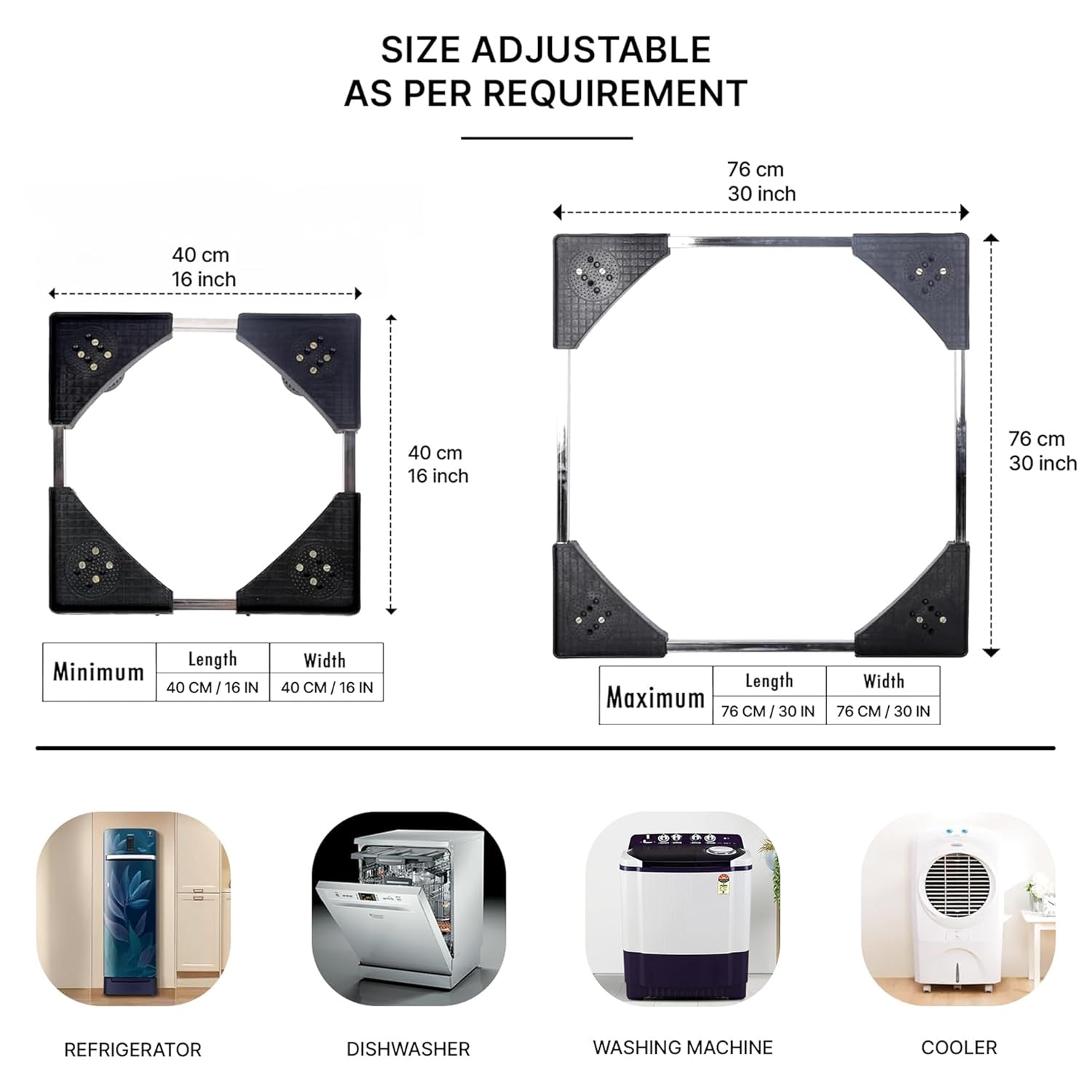 High Compatibility: This stand is suitable for top-load washing machines of all sizes, refrigerators ranging from 50 to 500 liters, and dishwashers of various dimensions. Its adjustable length spans from a minimum of 19×19 inches to a maximum of 30×30 inches, making it a universal solution for multiple appliances.