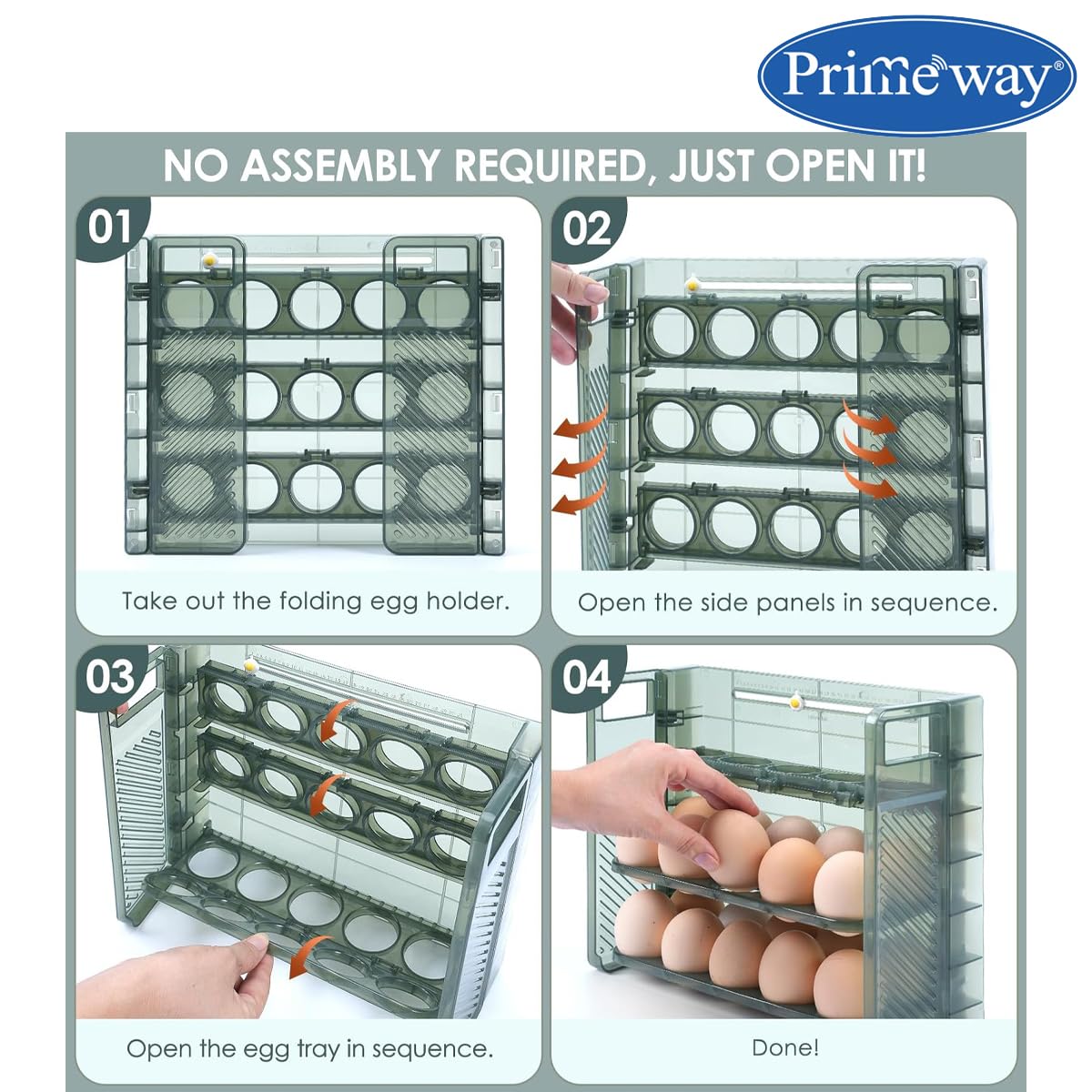 Egg crate design allows Unique Flip Egg Holder for Refrigerator and also stylish, making it a great addition to your kitchen decor. The top two layers can be flipped over once each layer is used up, easy to get the eggs, and put them in.