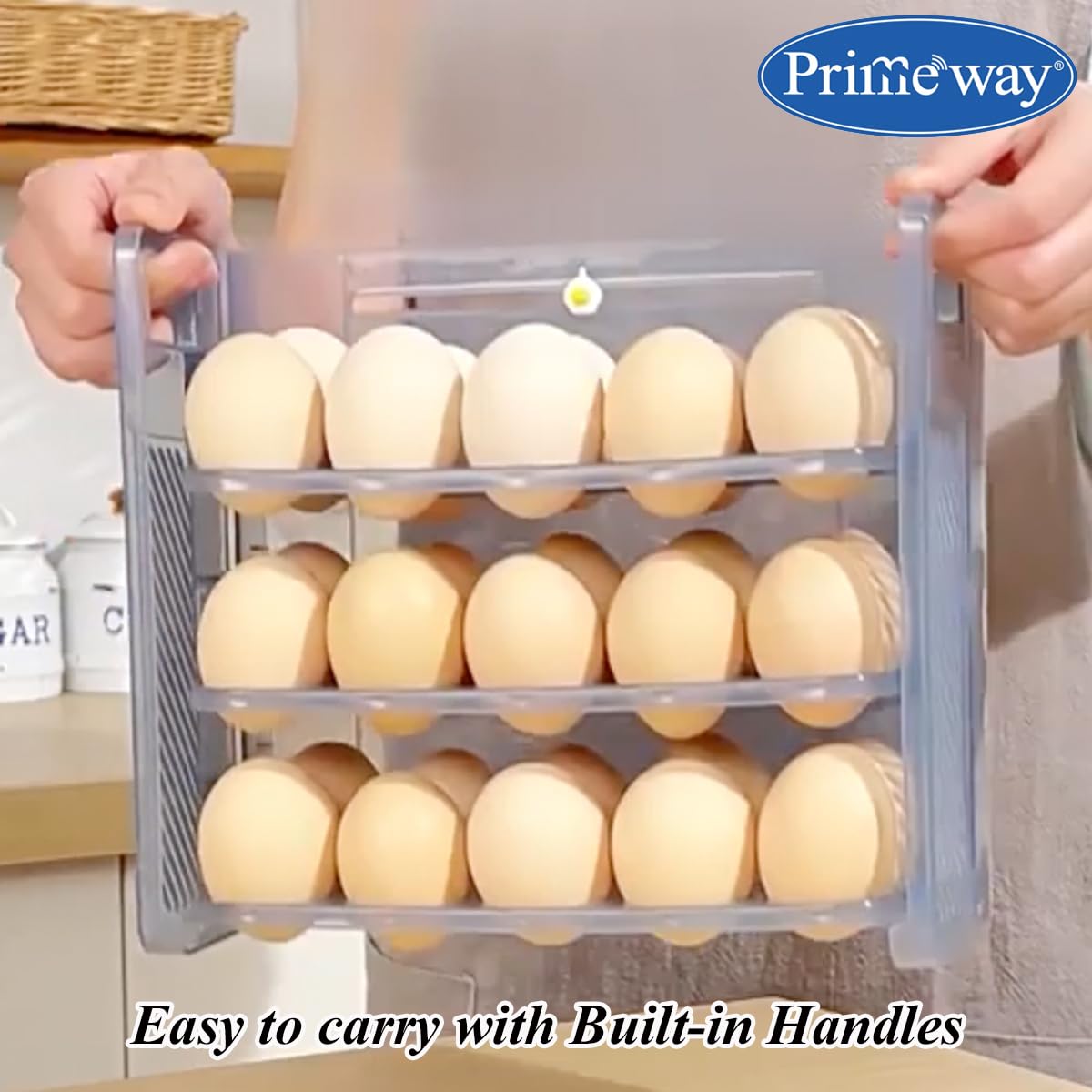 It’s the ultimate egg organiser for fridge. The egg container for fridge is made of durable materials, ensuring it lasts for a long time. The built-in handles on both side are made for easy pull-out and transport.