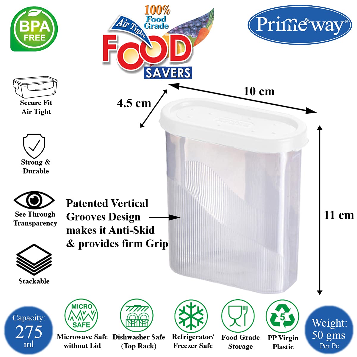 Primeway® Pp Air Tight Food Savers | Spices Containers | Masala Boxes | Kitchen Canisters for Fridge | 275ml Each | Pack of 10 Pcs | White – Plastic