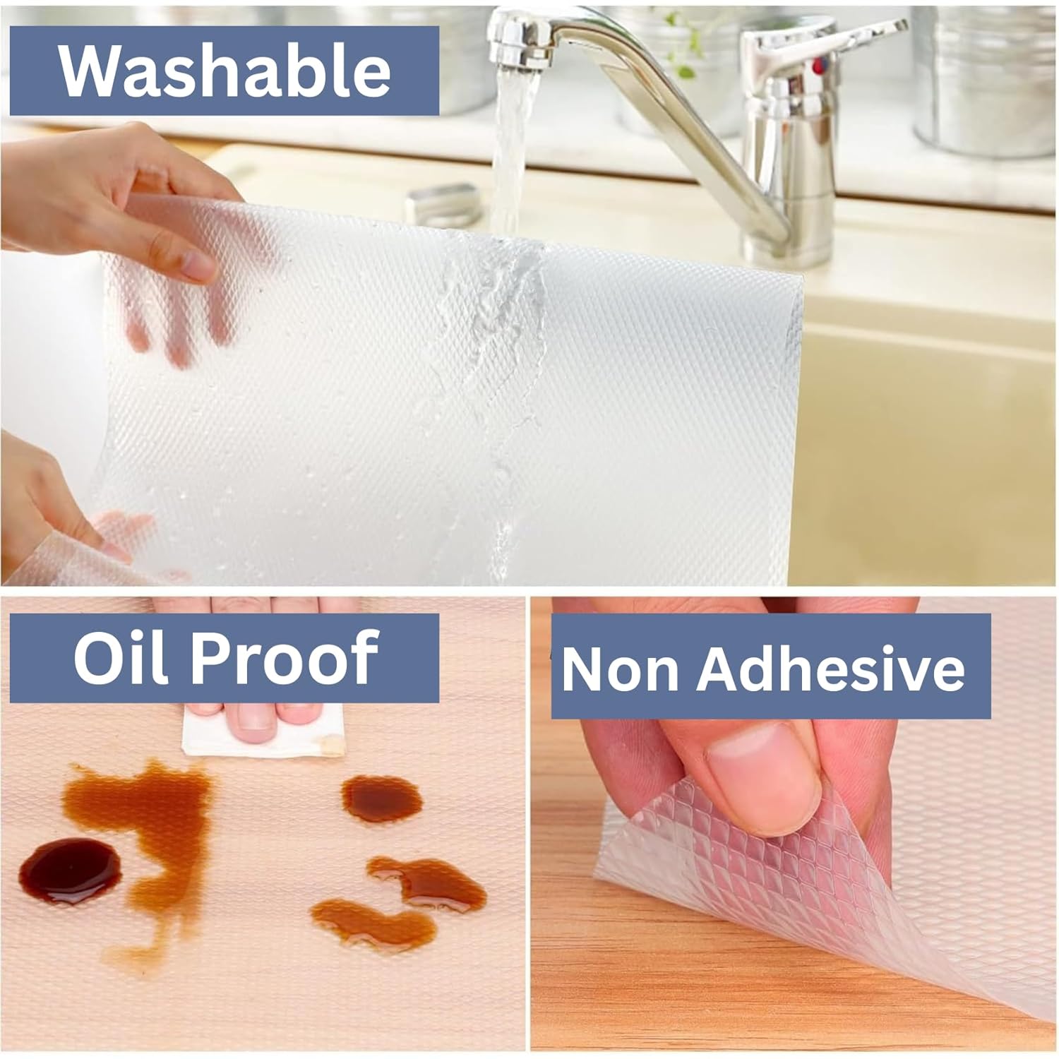 ✅ Durable, Washable & Easy to Clean – Made from high-quality material that’s long-lasting, reusable, and simple to maintain. Just wipe or wash to restore freshness for daily use. Premium plastic sheet for kitchen shelves and shelf liners for kitchen shelves.