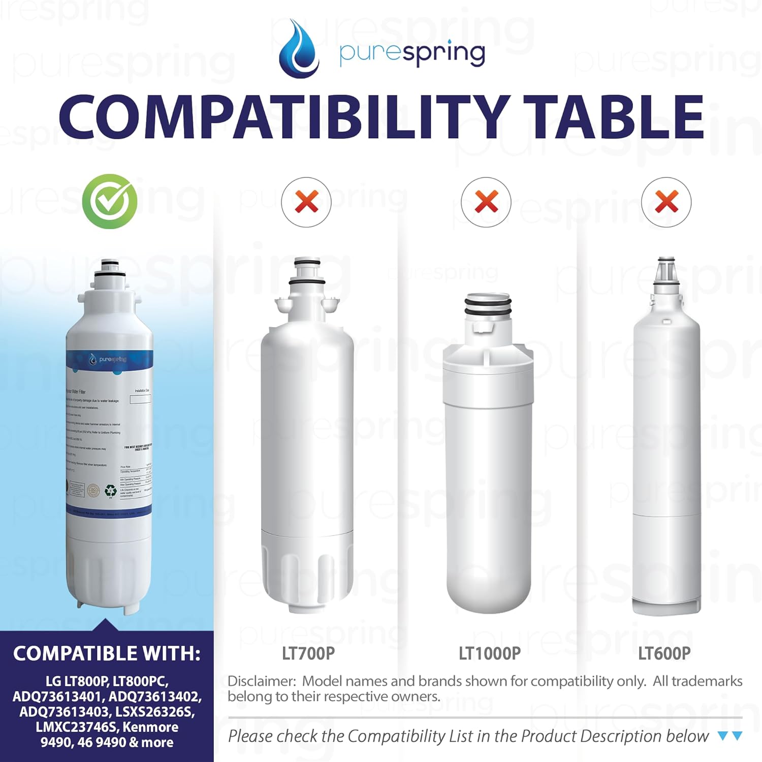 COMPATIBILITY GUARANTEED – This PureSpring compatible filter is a replacement for the following model numbers – LG LT800, LG LT800P, Kenmore 9490, Kenmore 46-9490, Kenmore 469490, ADQ73613401, ADQ73613402. This is a compatible spare part manufactured by PureSpring. The original manufacturer’s name and part numbers have been used for compatibility information only.