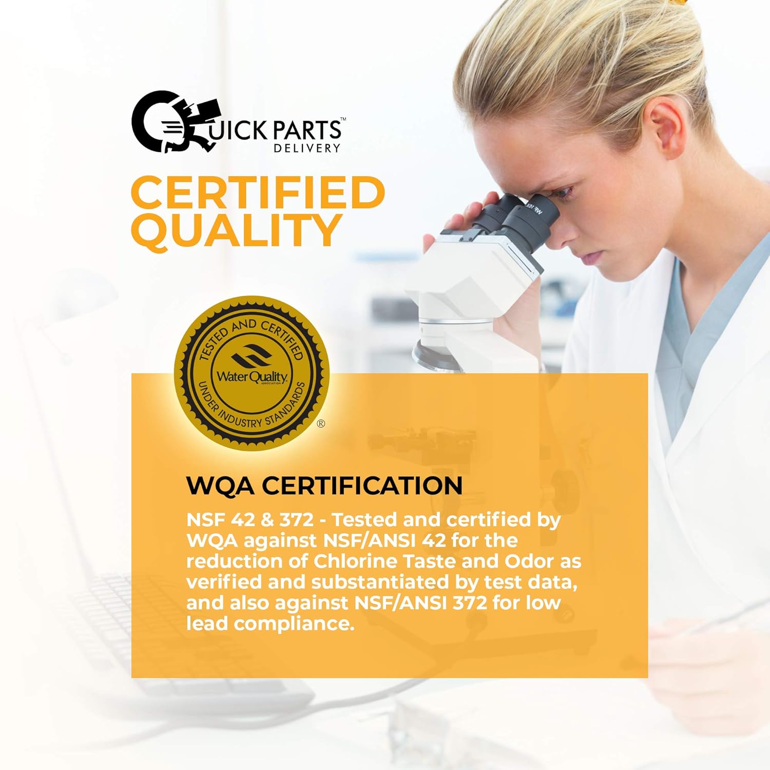 NSF 42 & 372- Tested and certified by WQA against NSF/ ANSI for the reduction of Chlorine Taste and Odor as verified and substantiated by test day, and also against NSF/ANSI 372 for low compliance