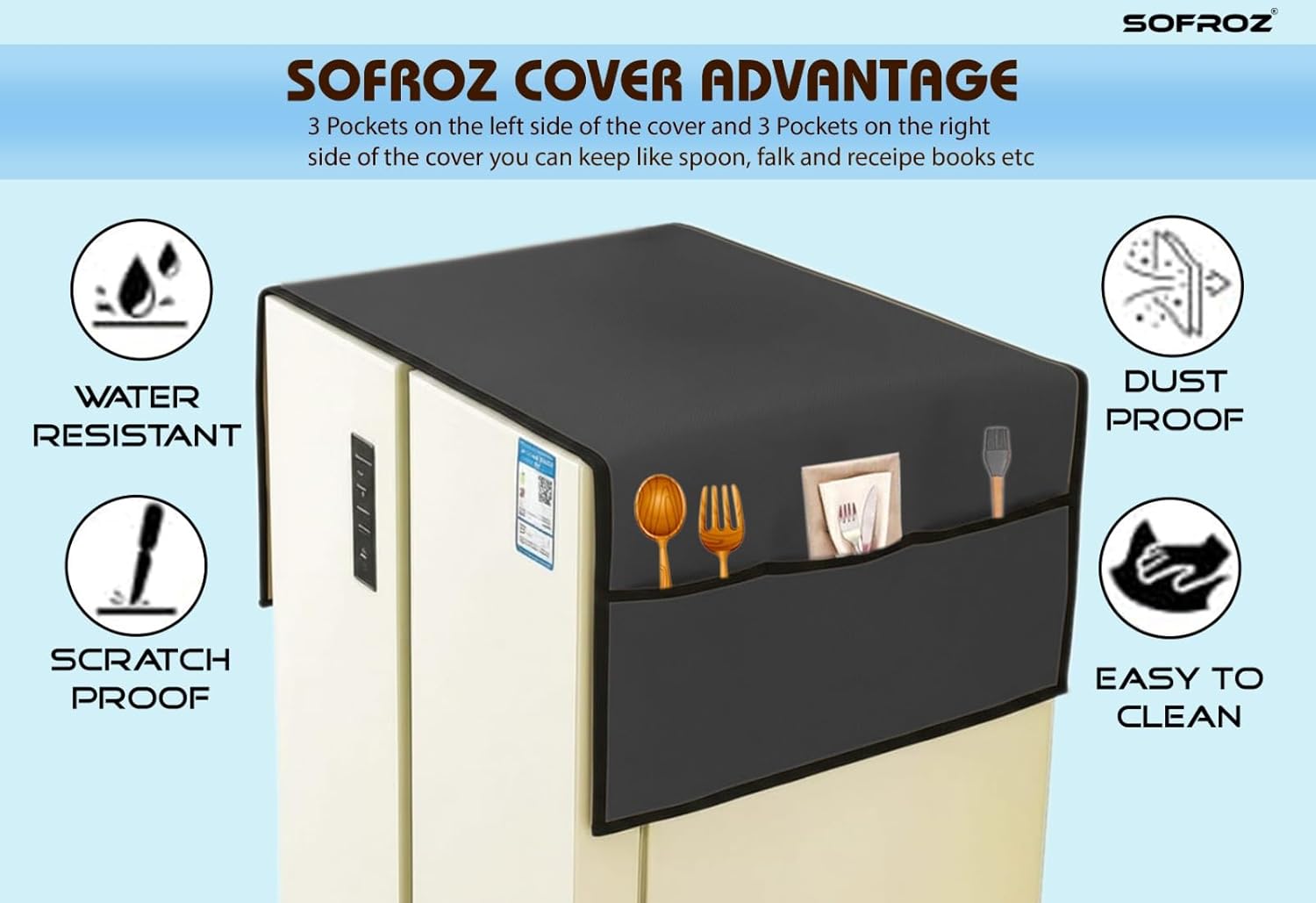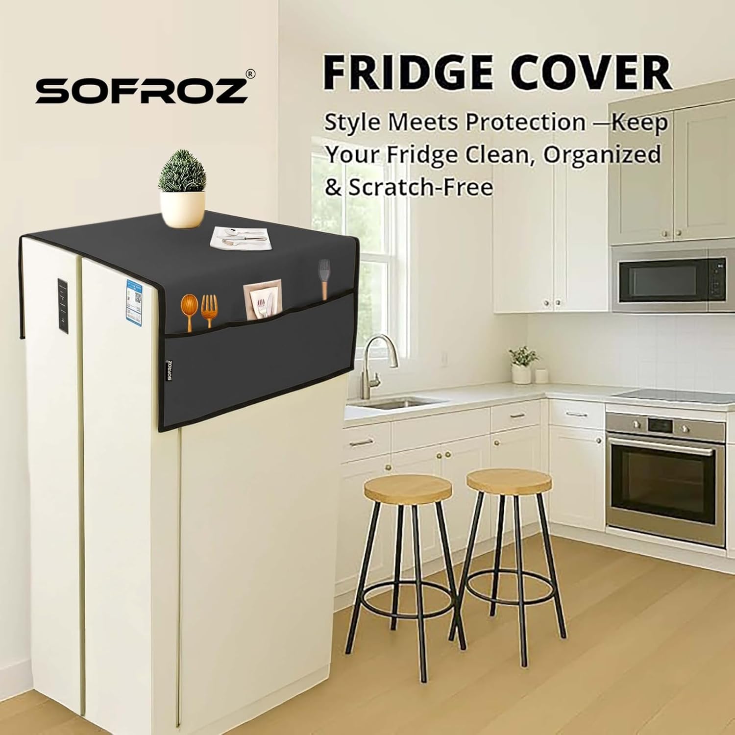 Sofroz Refrigerator Double Door Nylon Top Cover with 6 Storage Pockets will help you keep your refrigerator clean, safe, and organized. This cover, which is made of sturdy, water-resistant nylon, protects your appliance from spills, dust, and grime, extending its life and giving your kitchen a sleek, contemporary look. Dimensions: Made to fit typical double door refrigerators (170 x 65 cm), this cover makes sure your appliance is shielded from the weather, whether it’s from heavy dust, unintentional spills, or potentially damaging pets. It is the ideal combination of convenience and functionality, with six roomy storage compartments that offer a handy location to store commonplace goods like bottles, cleaning cloths, and kitchen tools. All that is needed to keep the easily cleaned nylon fabric appearing brand new is a quick wipe-down. This protective cover provides flexible protection for your refrigerator, washing machine, or any other household appliance while maintaining a clean and organized workspace. This top cover’s sleek black hue will go well with any kitchen or laundry room’s decor while providing both functional and visual appeal. This essential refrigerator accessory can protect your appliances and keep your kitchen looking great.
