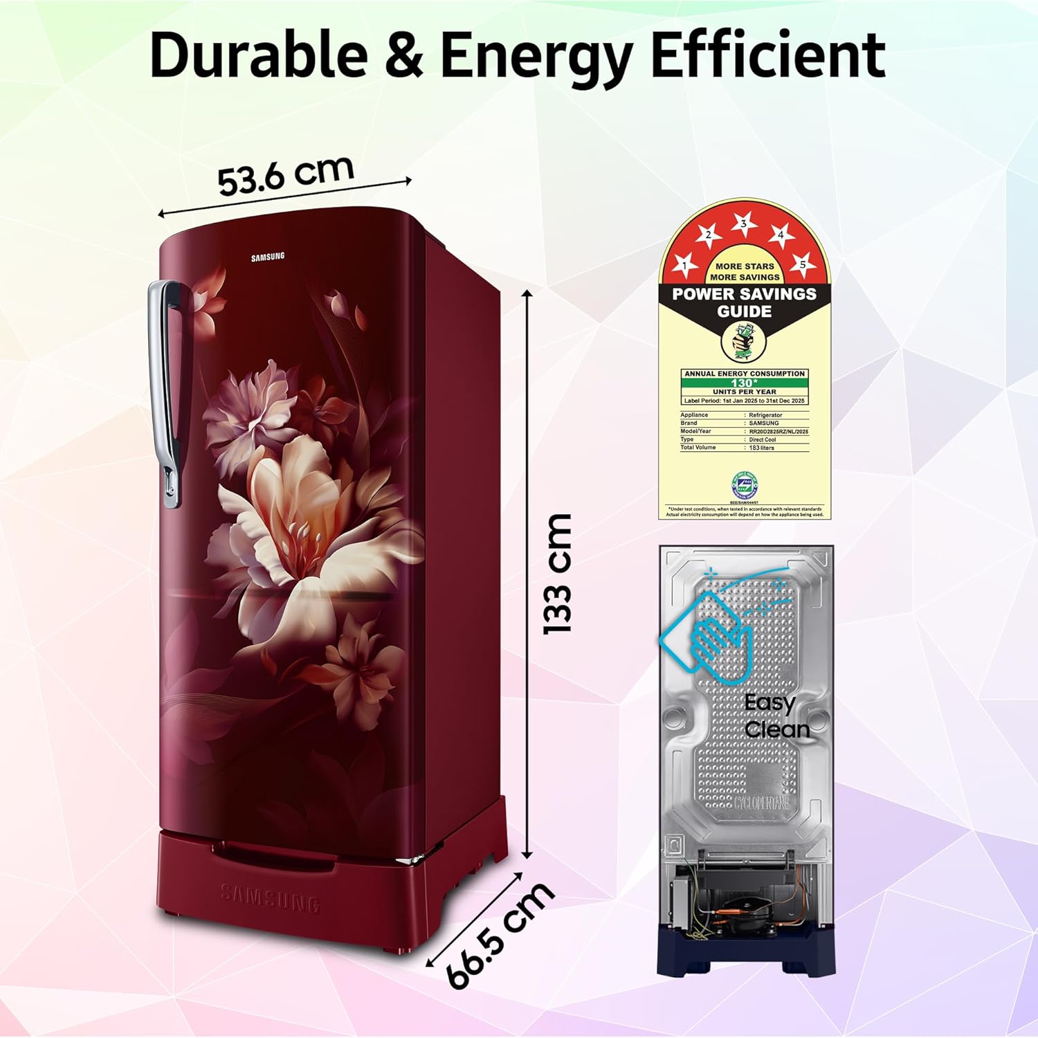 Samsung 183 L, 5 Star, Digital Inverter, Direct-Cool Single Door Refrigerator (RR20D2825RZ/NL, Midnight Blossom Red, Base Stand Drawer)