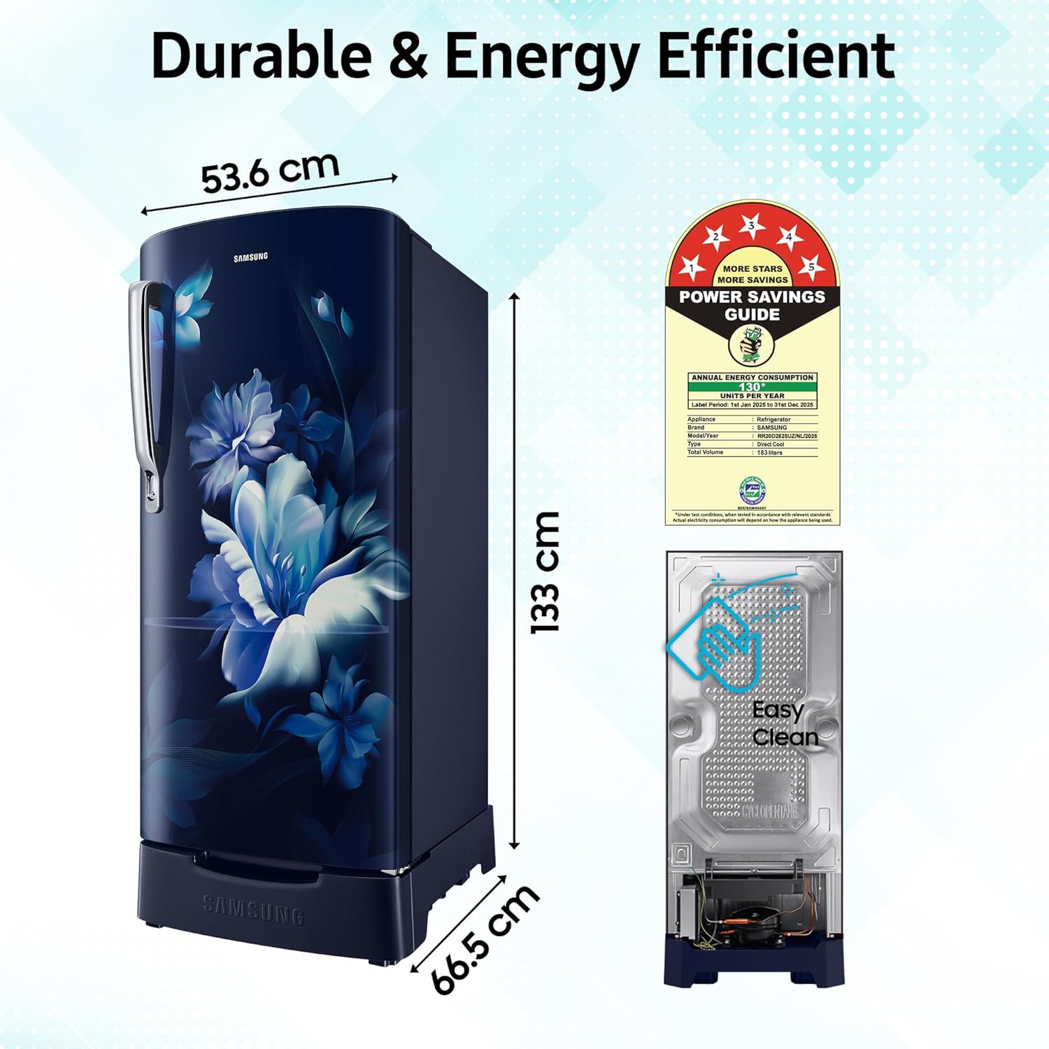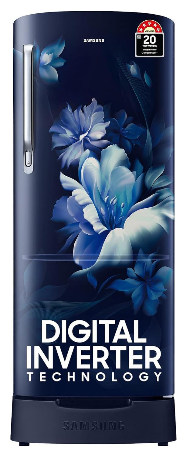 Samsung 183 L, 5 Star, Digital Inverter, Direct-Cool Single Door Refrigerator (RR20D2825UZ/NL, Midnight Blossom Blue, Base Stand Drawer)