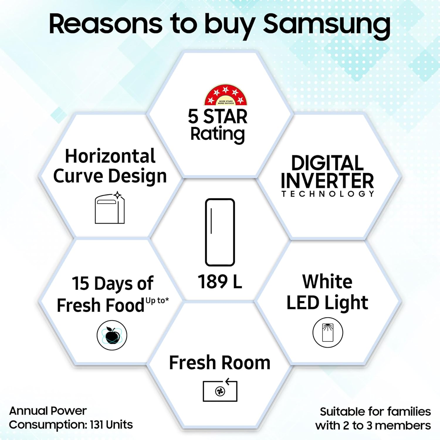8 reviews for Samsung 189 L, 5 Star, Digital Inverter, Direct-Cool Single Door Refrigerator (RR21D2H259U/HL, Paradise Bloom Blue, Base Stand Drawer)