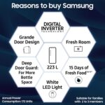 Samsung Exclusive Features : Fresh room | Grande Door Design | Stabilizer Free Operation (100v – 300v) | Smart Connect Inverter (Automatic) | Up to 15 Days of Fresh Food | Bar Handle | Lock & Key