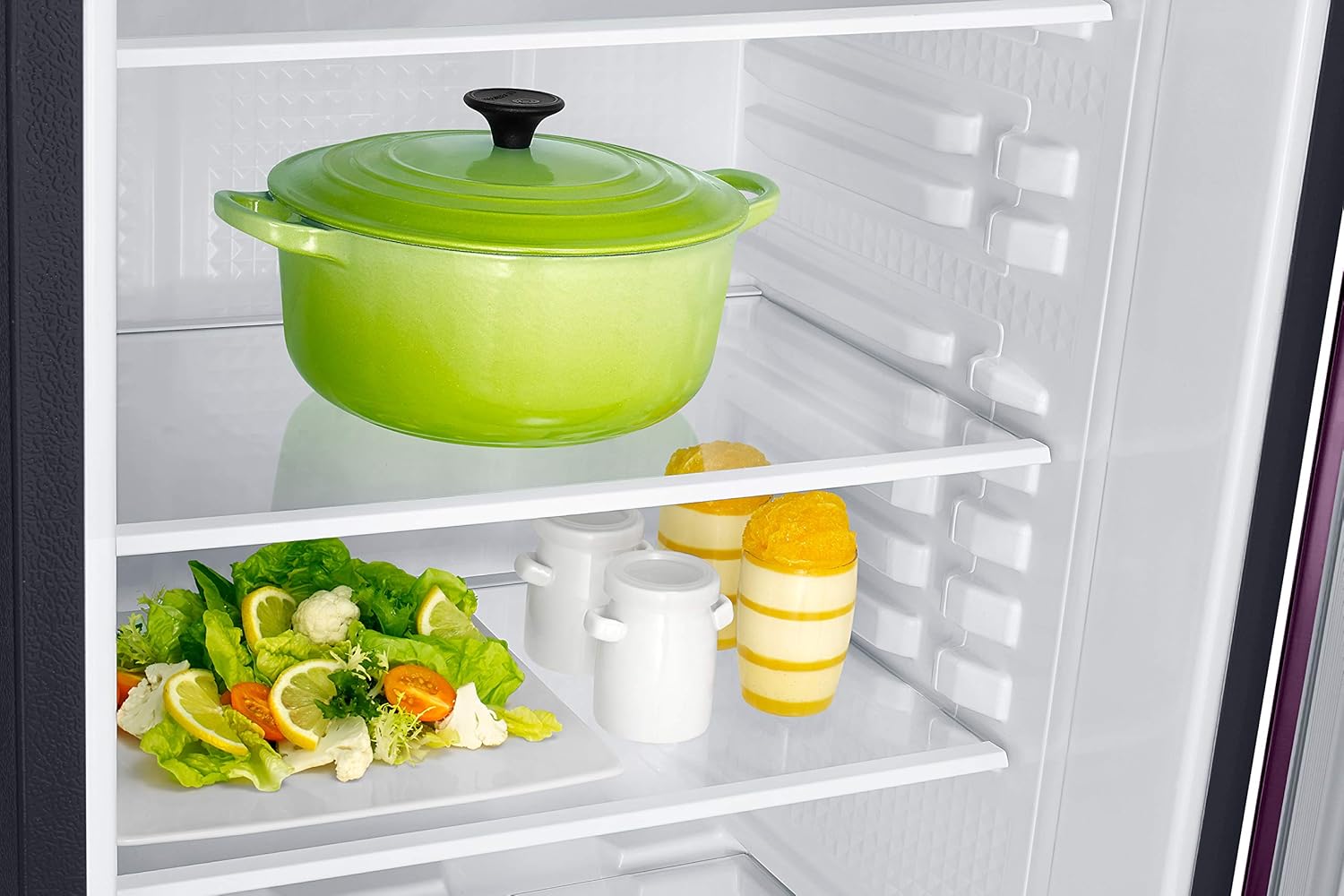Has a truly distinctive Grandé door design available in a choice of various colours. It enhances the look of refrigerator with a fine line aesthetically placed towards the bottom to add a sleek and elegant look to your kitchen.