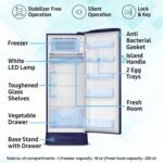 Interior Description : Fresh Food Capacity : 205 Ltr | Freezer Capacity : 18 Ltr | Total no. of compartments : 1 | Shelves : 3 | Vegetable Drawers : 1 | Shelf Type : Toughened Glass Shelves | Anti Bacterial Gasket | Base stand with Drawer for additional space for non-refrigerated food items