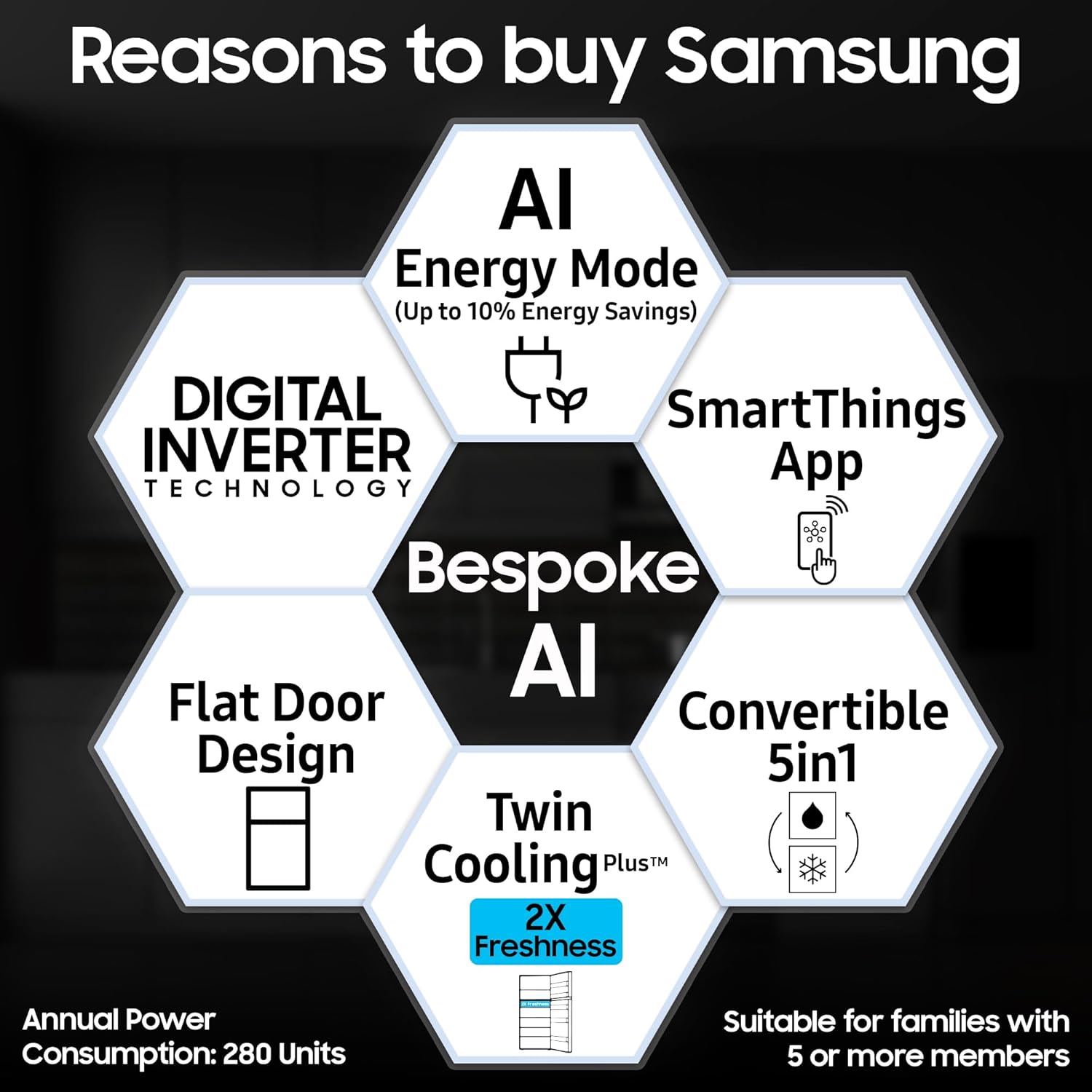 Samsung Exclusive Features : AI Energy Mode | Control with your Phone | SmartThings | Convertible 5-in-1 | Twin Cooling Plus | Fresh Room | Power Freeze | Power Cool