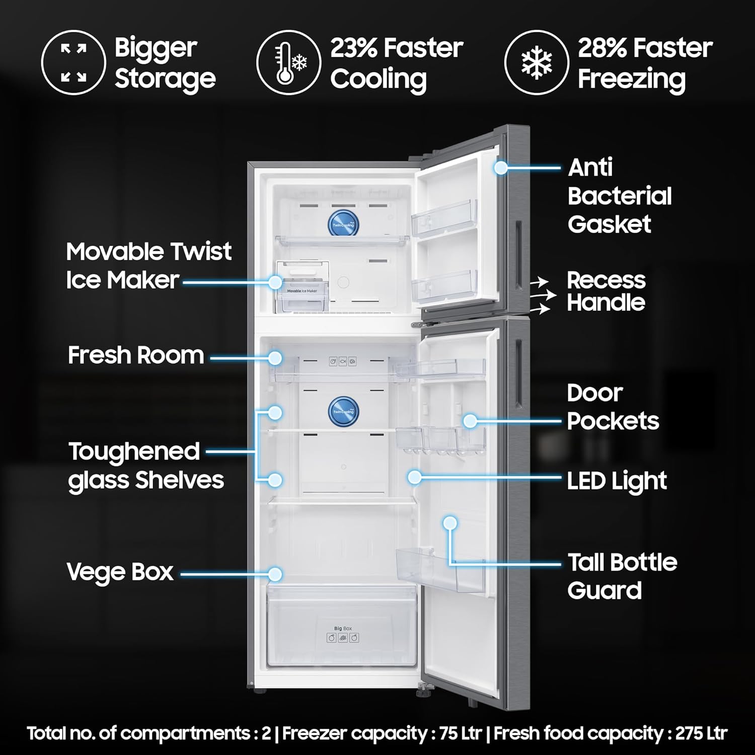 Interior Description : Fresh Food Capacity : 275 Ltr | Freezer Capacity : 75 Ltr | Total no. of compartments : 2 | Shelves : 3 | Vegetable Drawers : 1 | Shelf Type : Toughened Glass Shelves | Anti Bacterial Gasket | Temperature Control : Internal