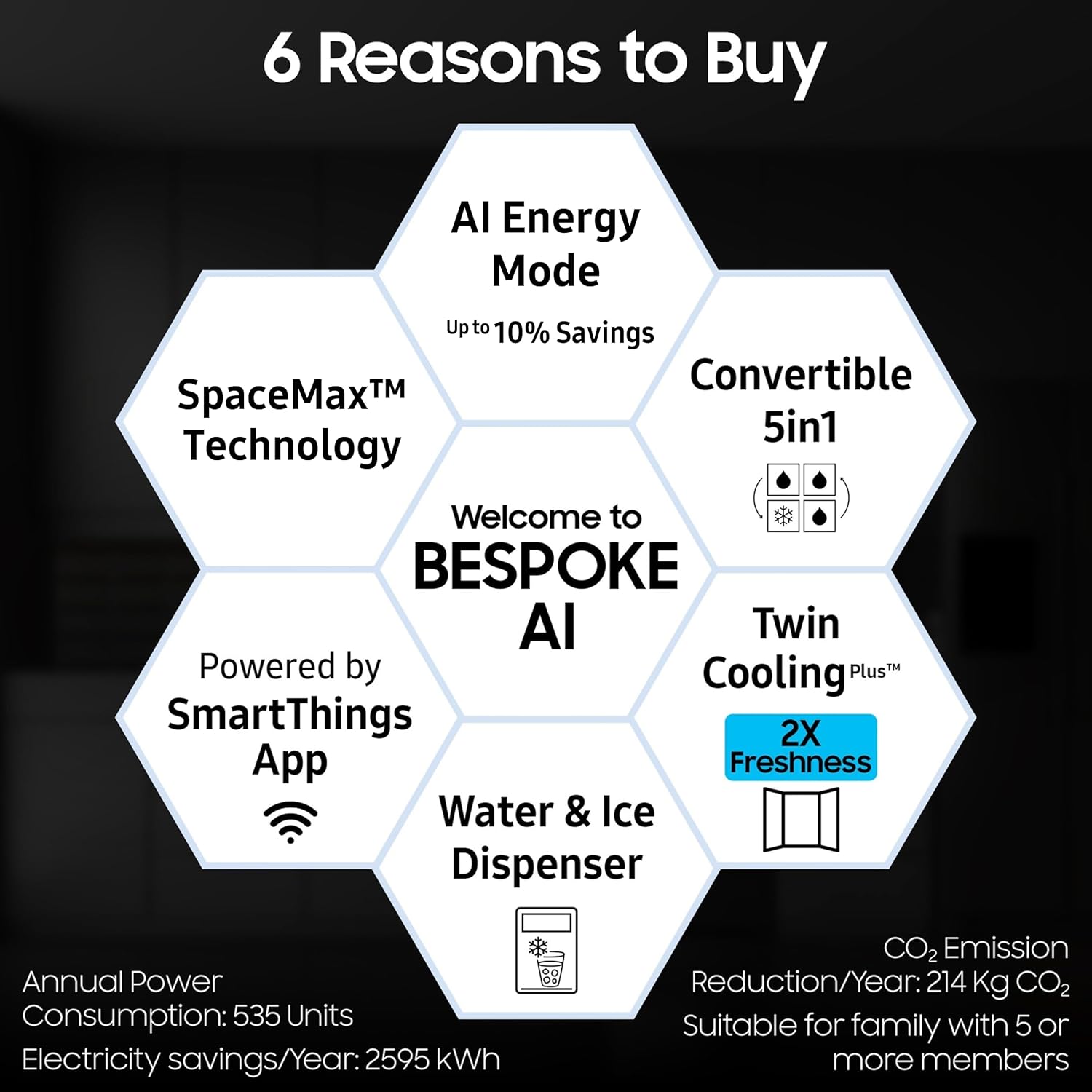 Special Features : Water & Ice Dispenser | Bespoke AI | Convertible 5-in-1 | Twin Cooling Plus| Wi-Fi Embedded | SmartThings App | Smart Things AI Energy Mode | Power Freeze | Power Cool | Fingerprint Resistant | Built-in Look