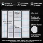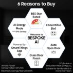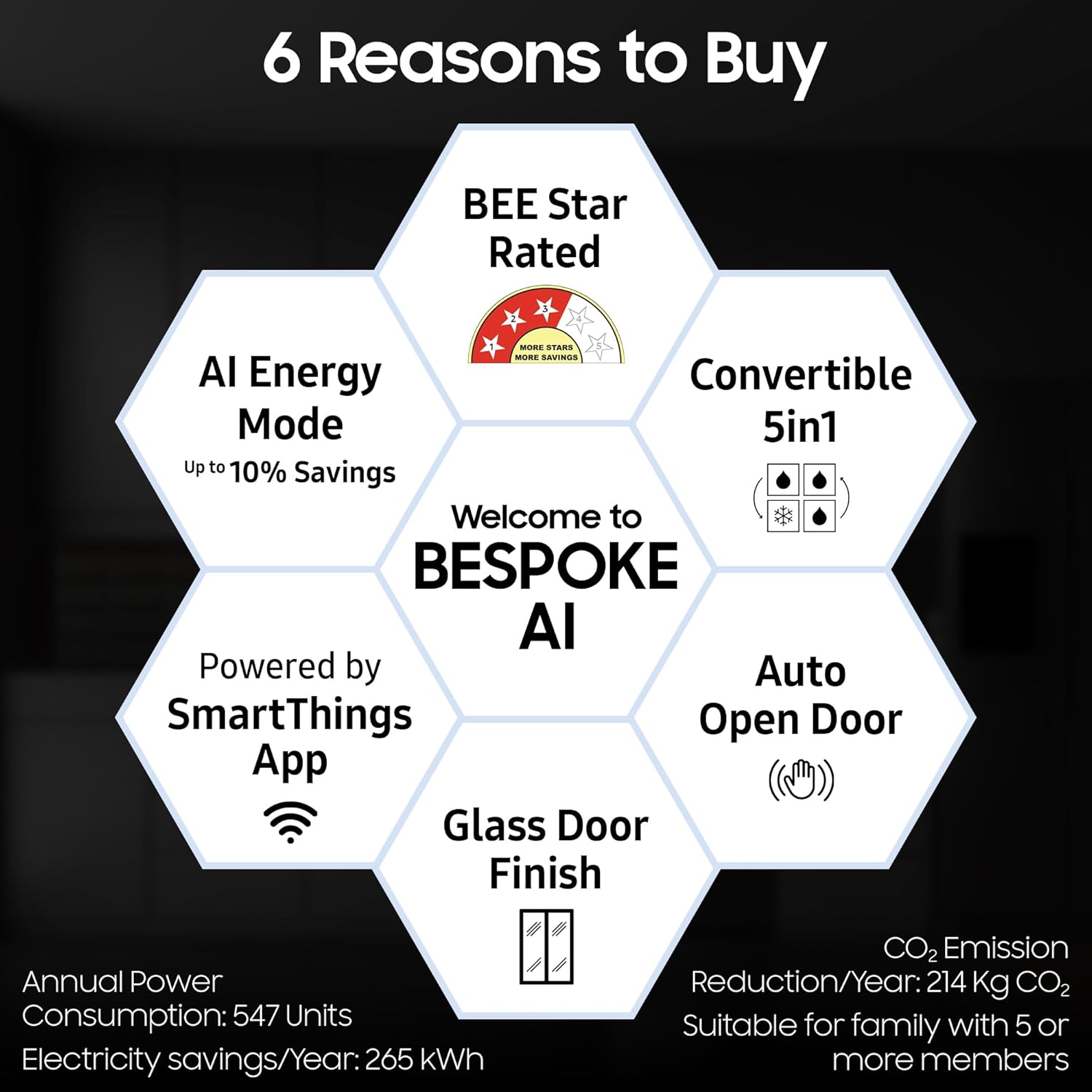 Special Features : Bespoke AI, Auto Open Door, Glass Door, Convertible 5-in-1 | Twin Cooling Plus| Wi-Fi Embedded | Smart Things App | Smart Things AI Energy Mode | Power Freeze | Power Cool | Fingerprint Resistant | Built-in Look