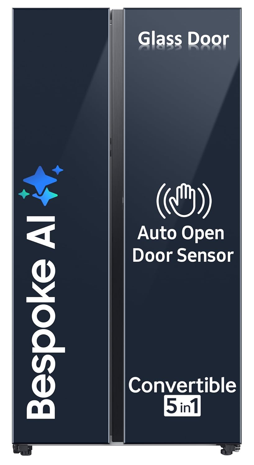 Bespoke Side By Side Frost-Free Refrigerators: Bespoke Glass Door Refrigerator with AI. With Convertible 5in1 mode best optimize your storage needs : |Normal Mode|Extra Fridge Mode|Seasonal Mode|Vacation Mode|Home Alone Mode