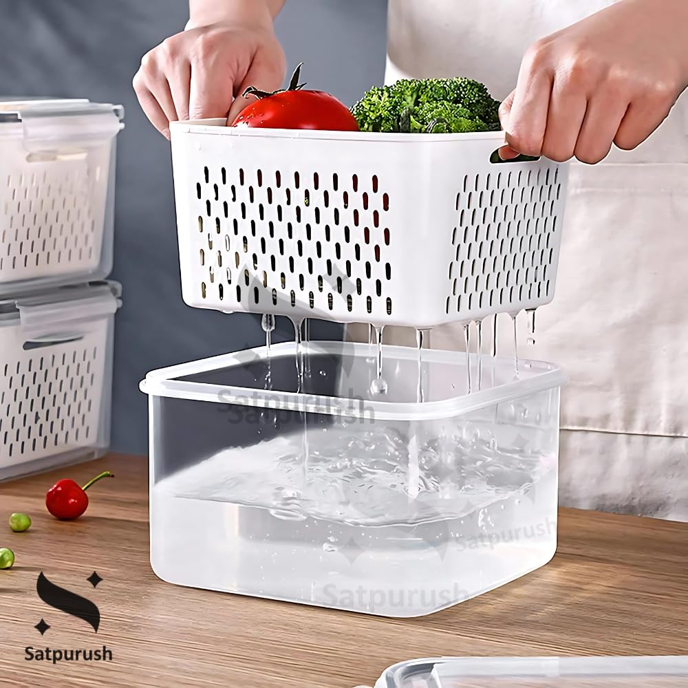Satpurush Fridge Storage Containers with Drain Basket – Airtight Kitchen Storage Box Set, Ideal Containers for Kitchen Storage (600ml (1N), 1400ml (1N), 2600ml (1N), 4500ml (1) – (4-Piece Set)