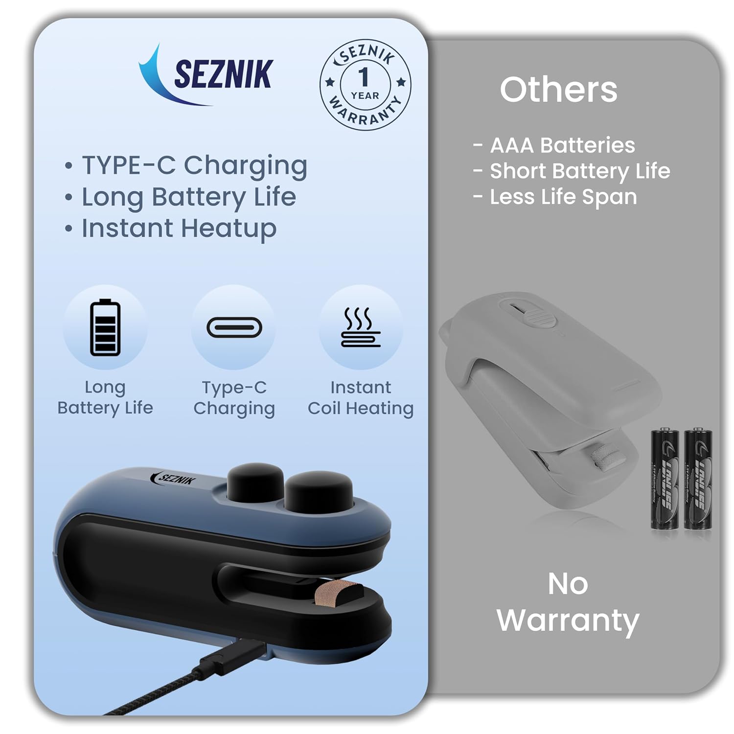 The Seznik mini sealing machine is a handy, easy-to-use gadget for resealing opened food packets and keeping snacks fresh. Its compact, handheld design makes it convenient to store and use anytime, and it seals most thin plastic bags quickly and effectively. The rechargeable battery adds to its practicality and eliminates the need for disposable batteries. Also comes in a cute little pouch.While it’s not suitable for thick or heavy-duty packaging, it works well for everyday kitchen use.highly recommended!!!