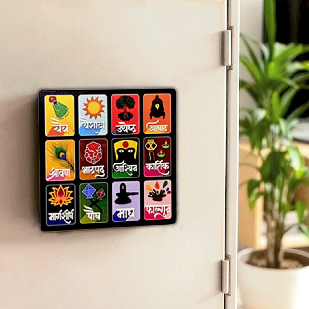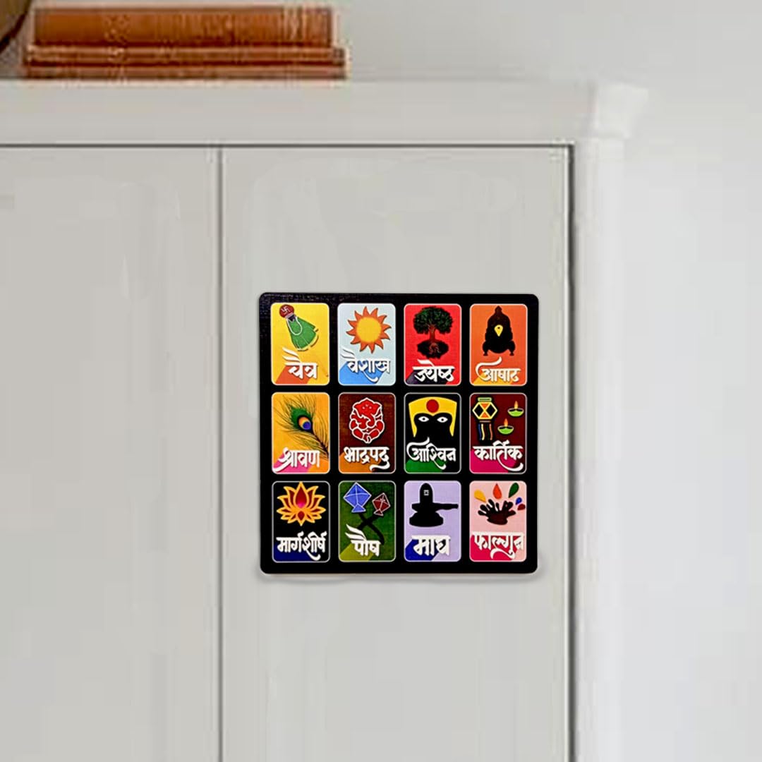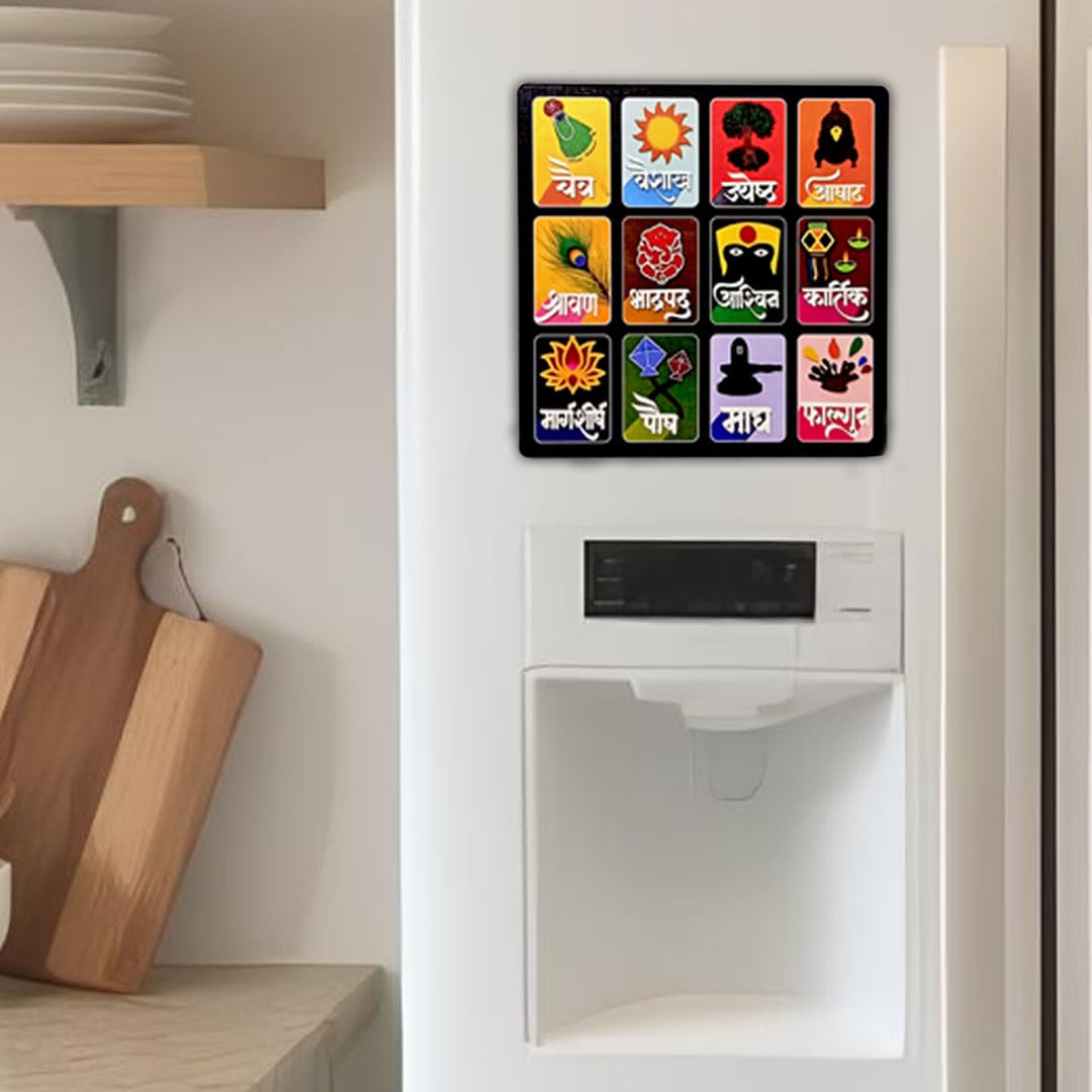 SOLOBOLO Marathi Month Calendar Fridge Magnet |Devanagari Panchang | Small Fridge Magnet| Cultural Home Kitchen Decor Item| Vastu Hindu Sanskrit Calendar | Durable Print | Size 6 Inch By 6 Inch, 1 Set