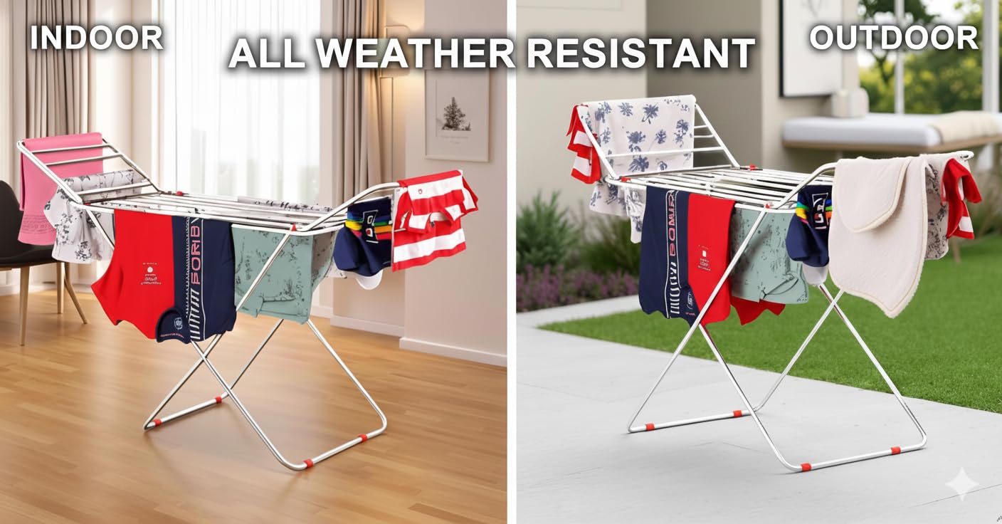 ✅ STRONG & LIGHTWEIGHT – Perfect for every home, this rack holds a large load of clothes across multiple rods. Its sturdy yet lightweight design makes it ideal for balconies and compact spaces.
