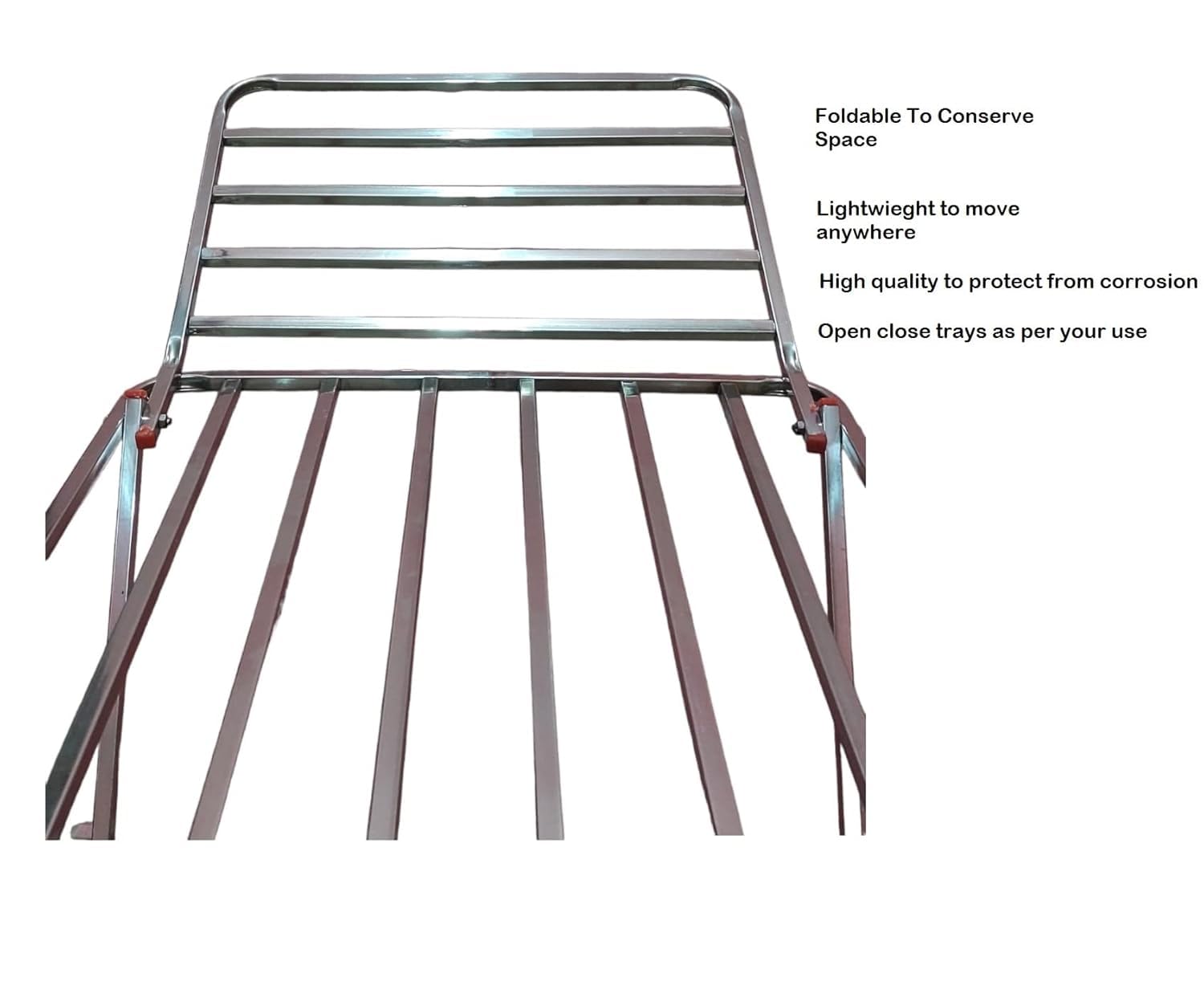Initially, I ordered Limerto SS stand. It was good but the height was less and requested Amazon for a replacement. They helped me in detail and I finally received this SS stand. The quality, strength, no of rails, finishing, locking mechanism are excellent with good height. We are extremely saitisfied and would recommend this product to anyone as it is cost efficient also with good discount by Amazon. Very strongly remommended to others. Just unpacked and started to use it. No tools are required. Area available to hang the clothes is high with six long rails and 4 short rails on each wing. An excellent product at this price is a good offer by AMAZON.