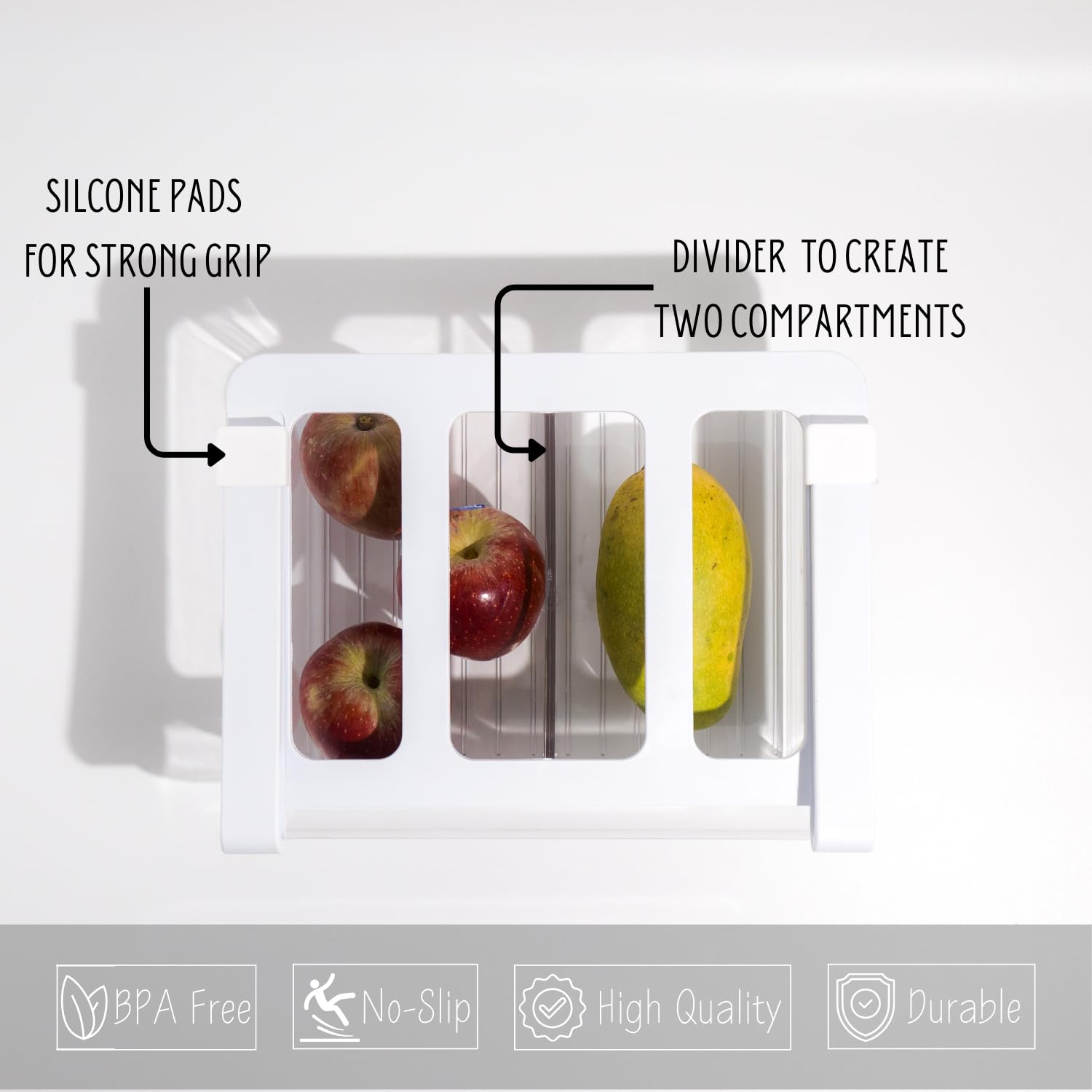 Maximize Storage Space: Organize your refrigerator efficiently with the Steelo SoFresh Sliding Organizer Tray, featuring a clear design and three partitions for easy separation of fruits and vegetables.