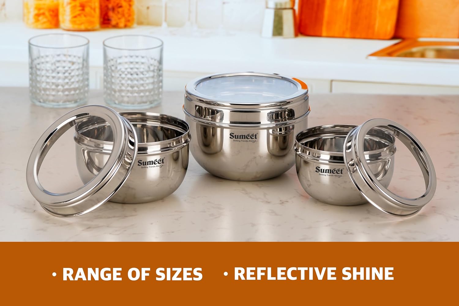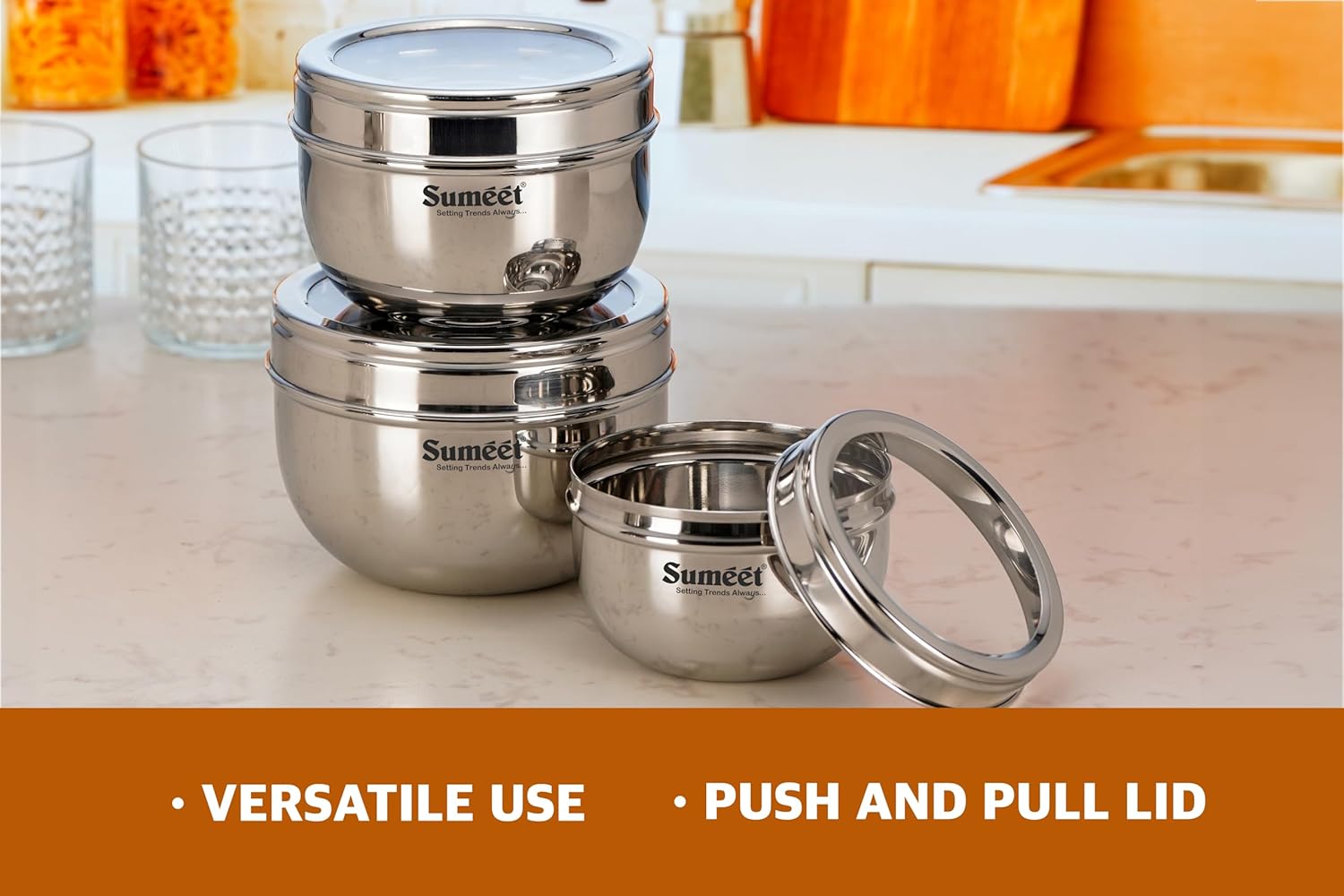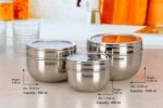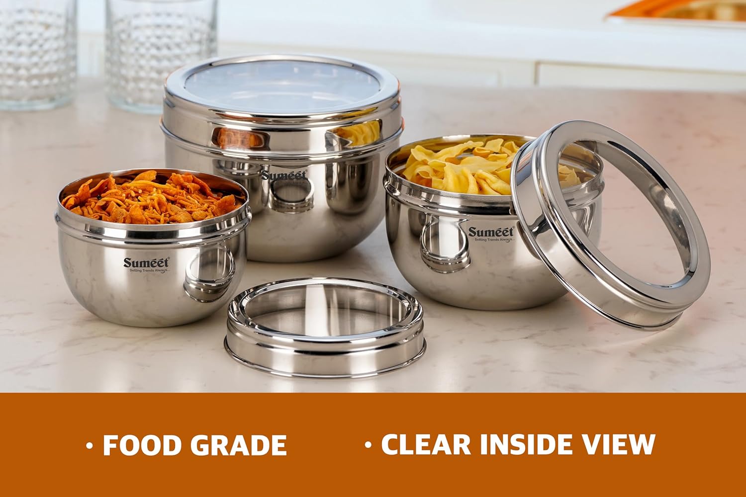 Absolutely love this Sumeet Stainless Steel Flat Canisters / Puri Dabba set! The quality is top-notch—solid stainless steel with a clean, premium finish that feels built to last. The flat design is super practical and saves a lot of space in the kitchen.The size variety (200ml, 350ml, 500ml, 800ml) is perfect for everyday use—great for puris, snacks, spices, dry fruits, or even small meal portions. The lids fit snugly, keeping everything fresh, and the containers are easy to clean and maintain.Simple, sturdy, and very functional. If you’re looking for durable, hygienic storage with a classic look, this set is a great buy. Highly recommended!