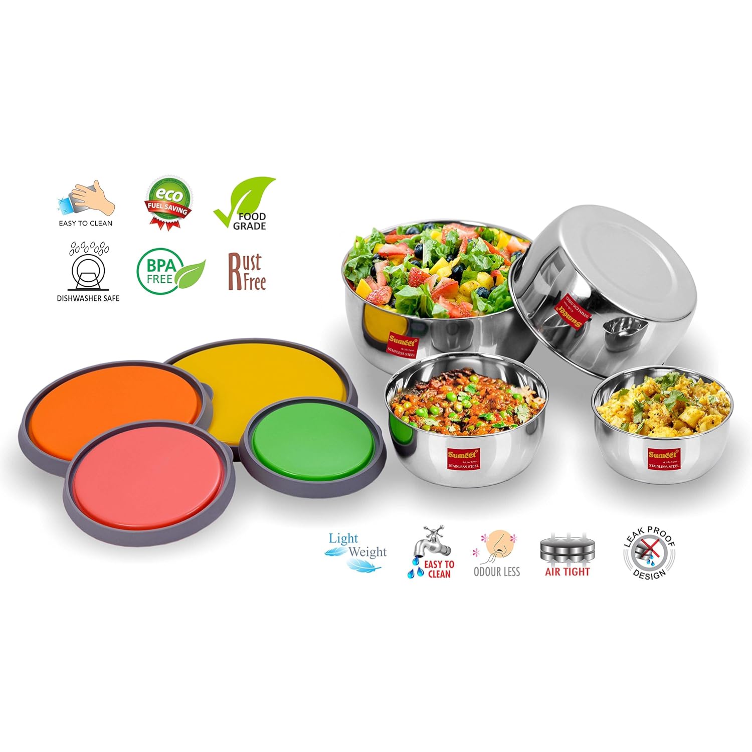 Highly handy, easy-to-use, occupies less space and elegant Steel bowl with airtight lids to prevent Moisture