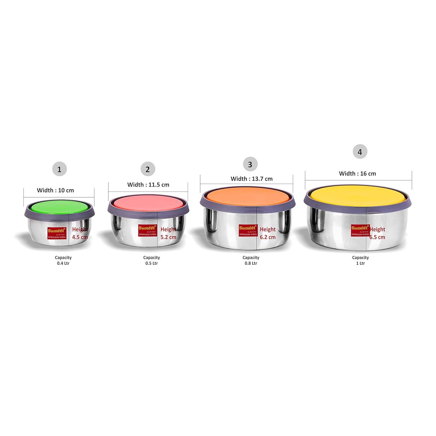 [IN THE PACKAGE]:4 Containers; [DIMENSION]: No. 1 – 400ML, No. 2 – 500 ML, No. 3 – 800 ML, No. 4 – 1 Ltr