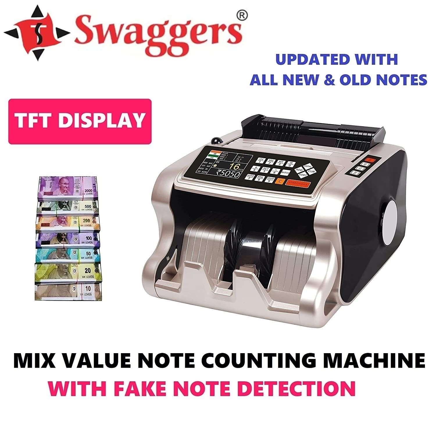 Swaggers Gold Value Updated Mix Note Value Counting Machine for New Indian Currency with Fake Note Detection