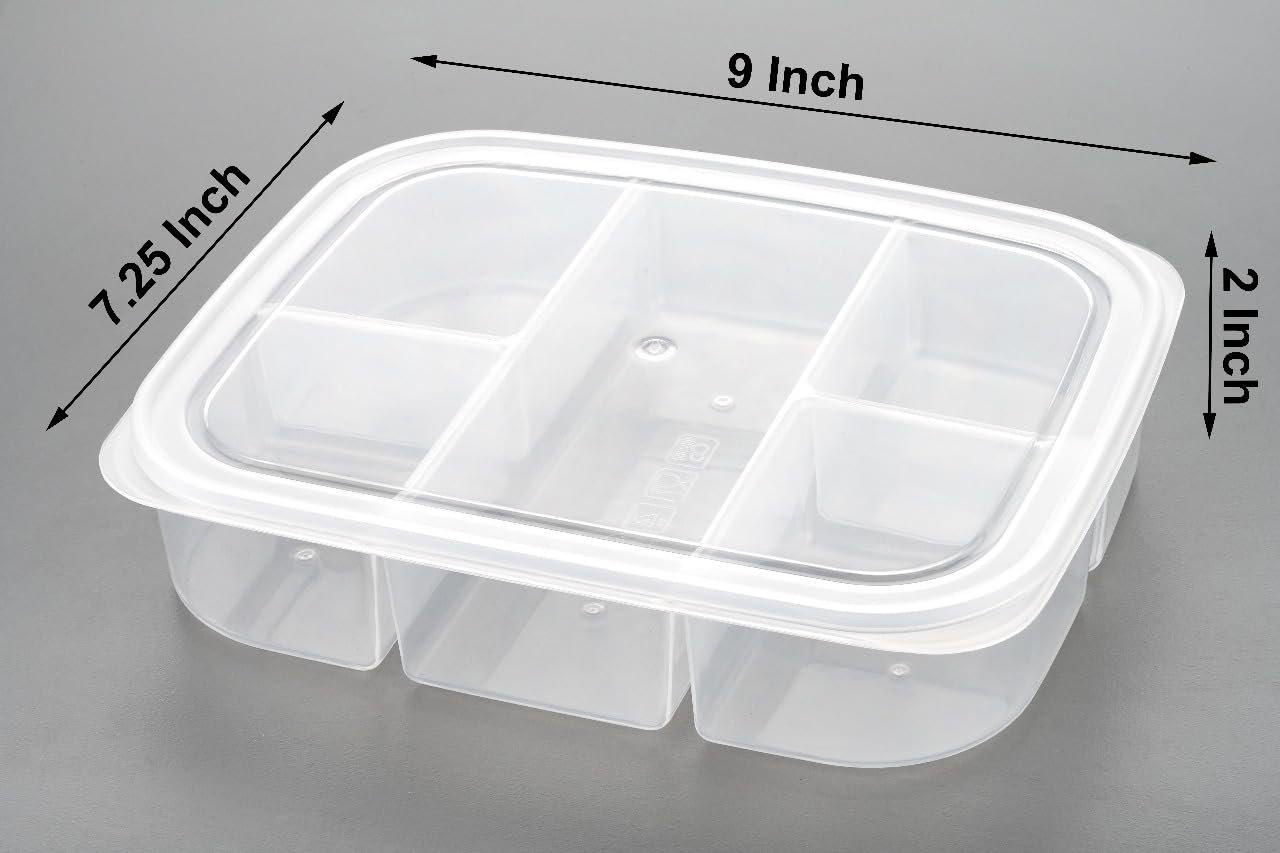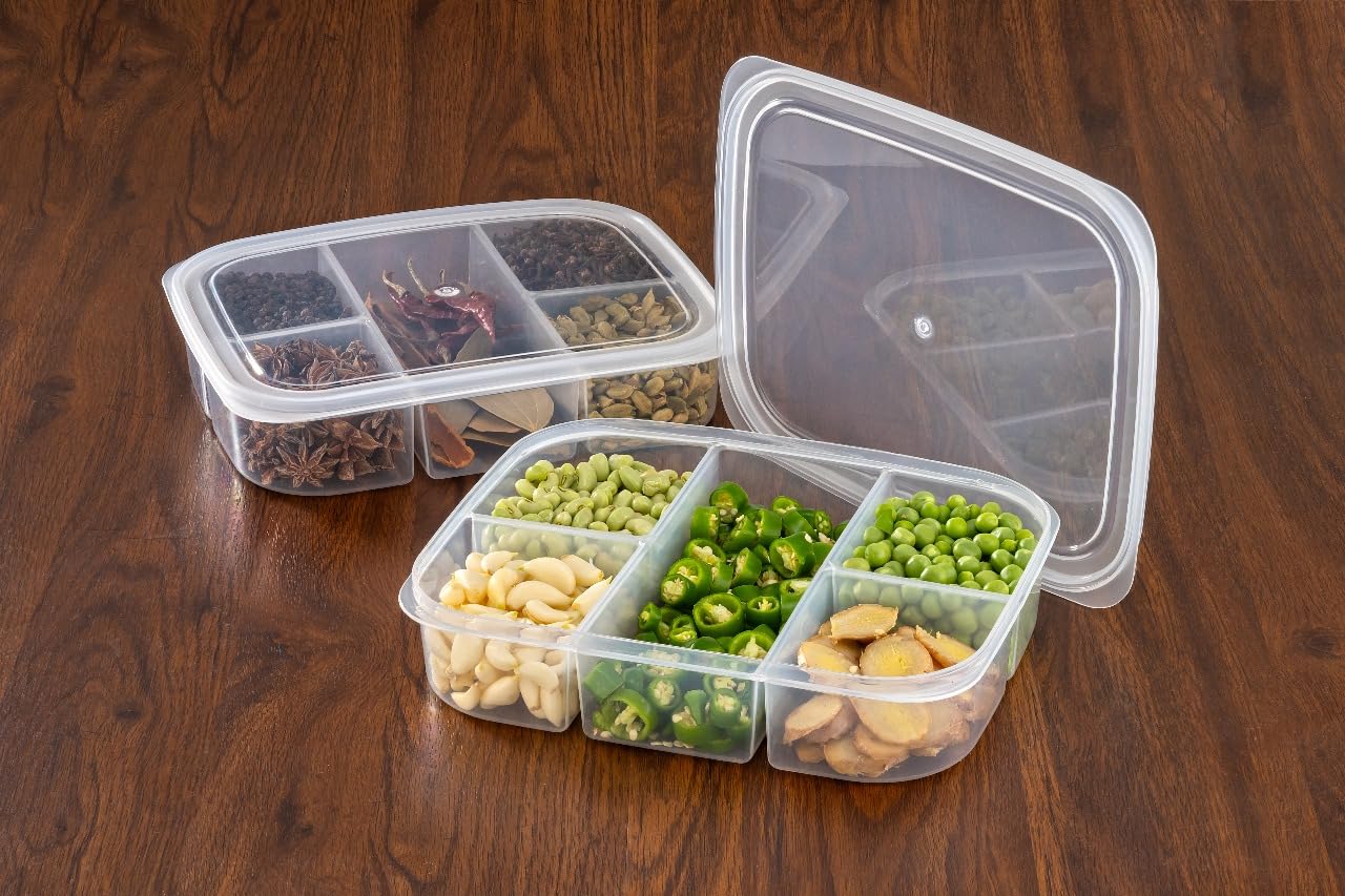 This container is really useful for keeping chopped vegetables and spices organized in the fridge.The compartments are well-sized and help save time while cooking.The material is strong and the lid fits tightly.