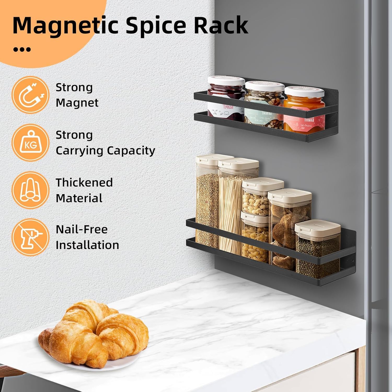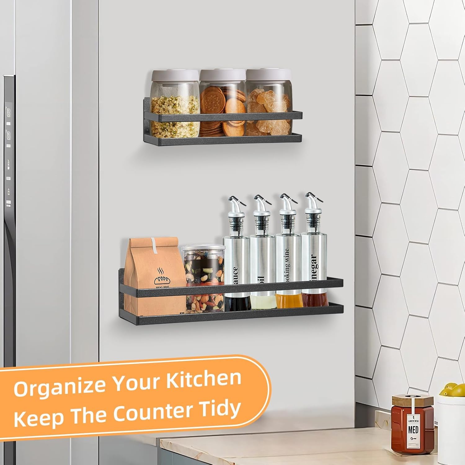 MAXIMIZE SPACE WITH OUR MAGNETIC SHELF FOR FRIDGE Enhance your kitchen organization with our magnetic shelf for fridge, designed to hold fridge accessories items while saving valuable space. This innovative fridge organiser keeps everything in reach, making your cooking experience more efficient.