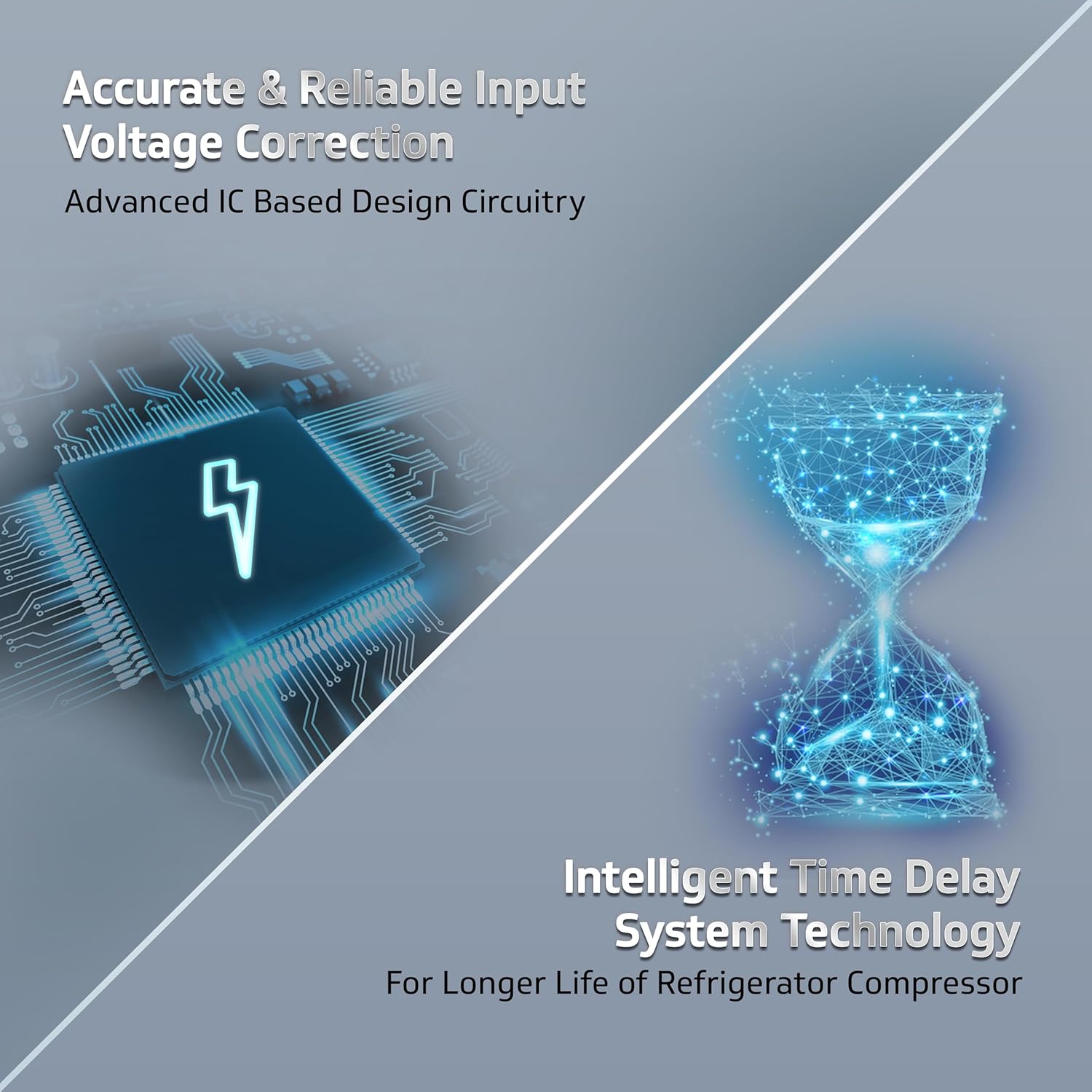 Intelligent Time Delay System: The Elegna 1000 stabilizer features an intelligent time delay system that automatically adjusts the delay based on the duration of power cuts. For brief interruptions, it quickly restores power to the refrigerator, ensuring uninterrupted cooling and food preservation, while protecting the compressor from frequent fluctuations and extending its lifespan.