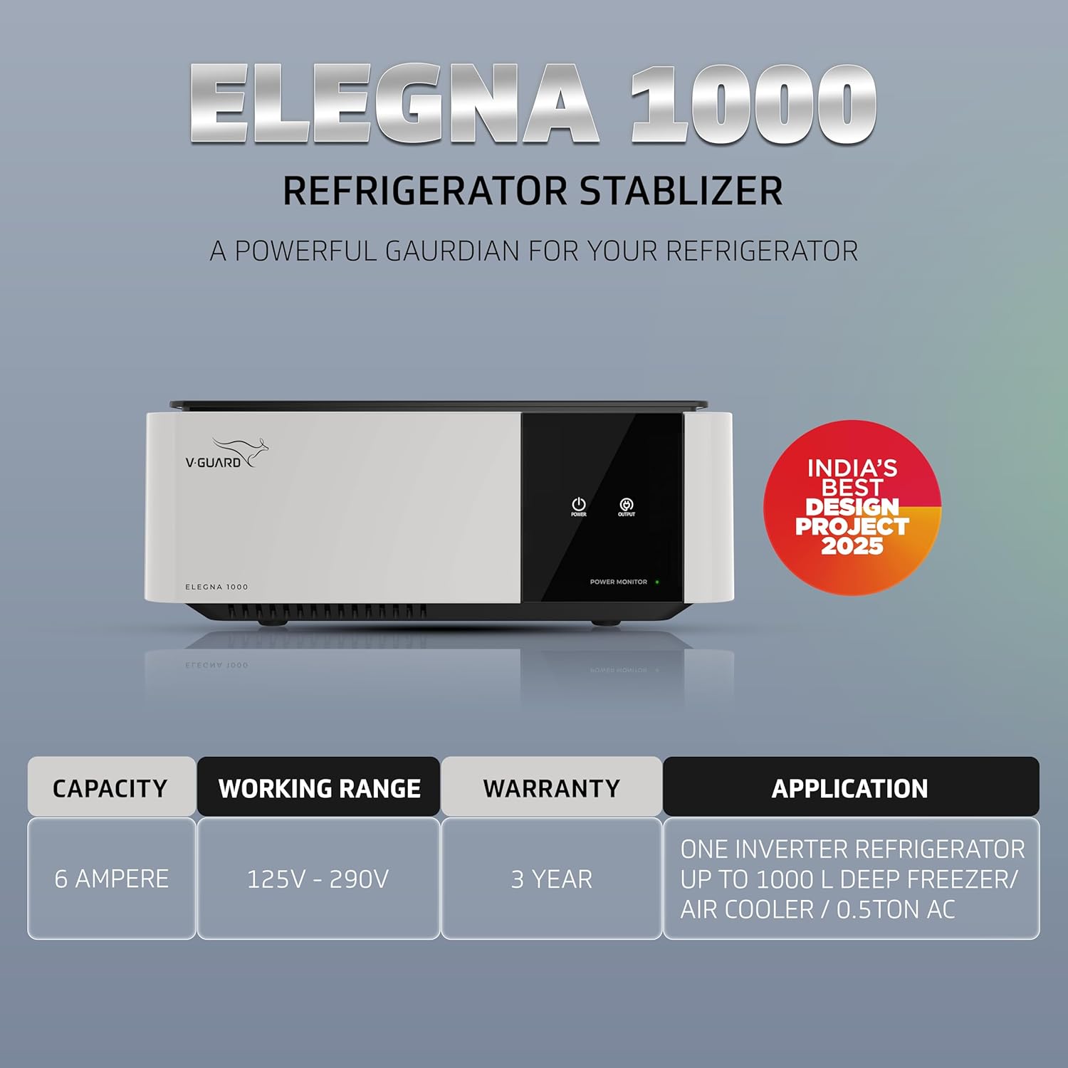 V-Guard Elegna 1000 Stabilizer for Inverter Refrigerator up to 1000 Litre | India’s Best Design Project | Wide Input Voltage Range (Working Range 125 VAC-290 VAC) | 3 Year Warranty by V-Guard | Grey