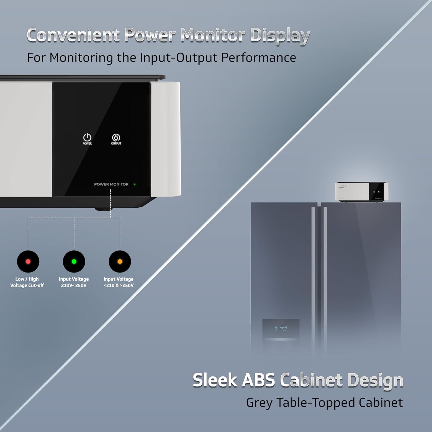 Power Monitor with Colour Changing LED Lights : Monitor the performance of Elegna 1000 with a digital display that provides real-time information on the input and output performance of the stabilizer. This allows you to stay informed about the power supply status and take corrective action if necessary.