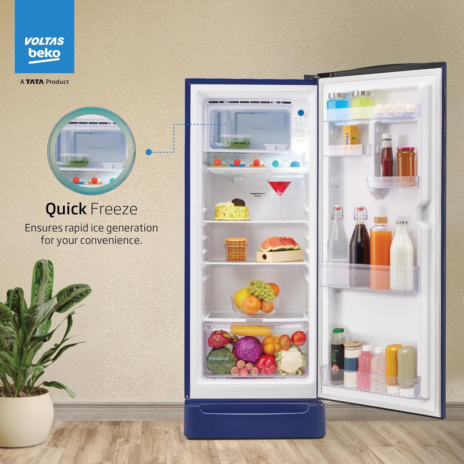 Voltas Beko, A Tata Product 228 L 5 Star Direct Cool Single Door Refrigerator (RDC260A/W0BBRTM0B00GO, Bonita Blue, With Fresh Box Technology, Quick Frezze, Chiller Zone and Base Drawer)