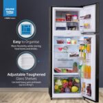 The refrigerator features adjustable toughened glass shelves, offering flexibility for organizing items of various sizes with durability.