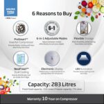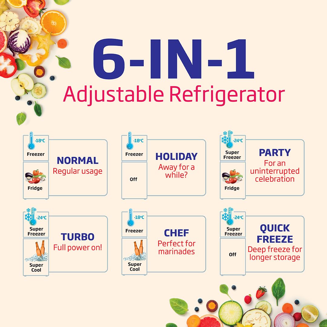 Special Features : 6-in-1 adjustable modes | ProSmart Inverter Compressor | Electronic Temperature Control and Display| Adjustable Toughened Glass Shelves| FlexLift Door Shelf| 2 L Bottle Storage| Door Alarm