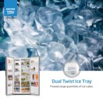The dual twist ice tray allows for easy and quick ice removal with a simple twist. It ensures consistent ice cube formation and provides a convenient way to serve ice. The tray’s design prevents spills and messes during the ice-making process.