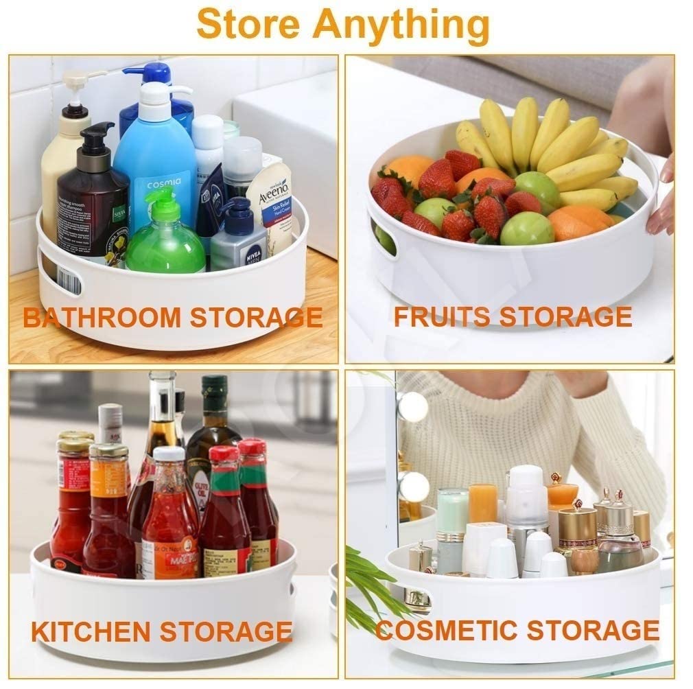 360° revolving tray provides organized, easy-access to hard-to-reach items. High Grade Plastic material, open and large size gives you more space and organization. Great for putting on table-tops, in fridges, and in cabinets to help store and organize spices, milks, shampoos etc. Perfect for home storage.