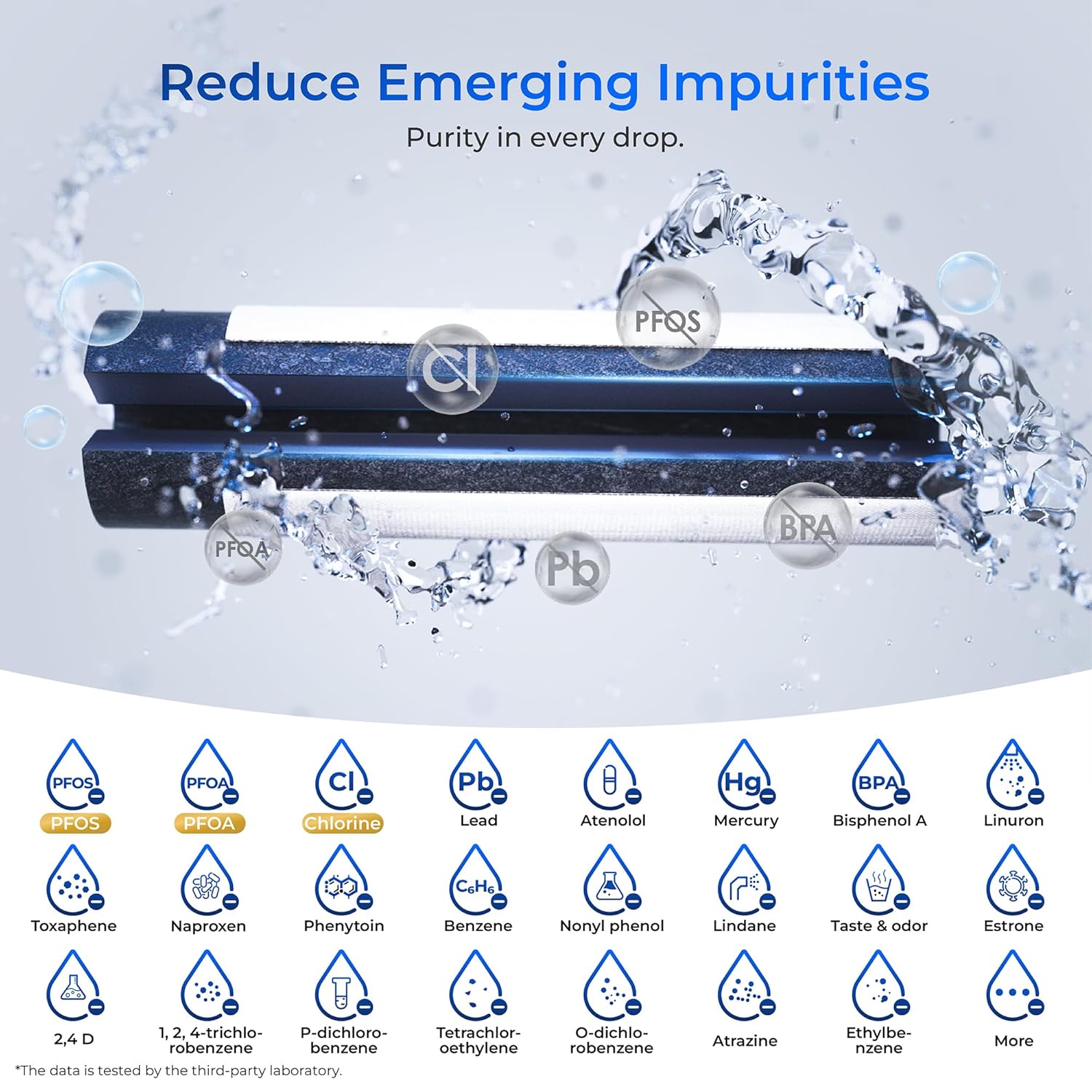 [Carefully chosen materials] Waterdrop uses coconut shell carbon blocks supplied from Sri Lanka that have enlarged surface area and more micropores than inferior carbon blocks. The filter cartridge is far more effective in reducing levels of chlorine, dirt, sediment, rust, and a wide range of heavy metals. In line with our high level of attention to detail, we have chosen a BPA-free and food-grade housing for the filter that exceeds the NSF 372 certification for lead-free filtration.