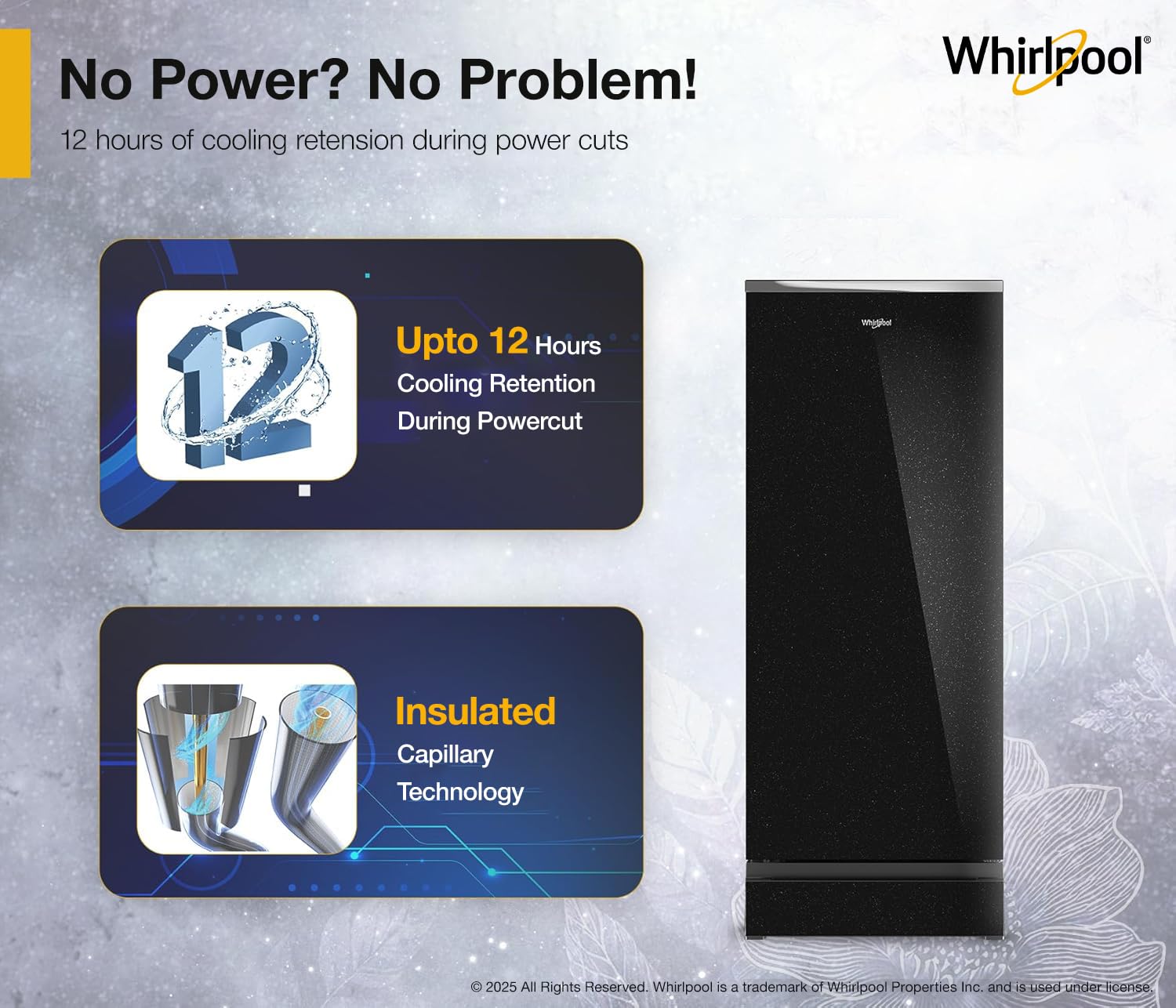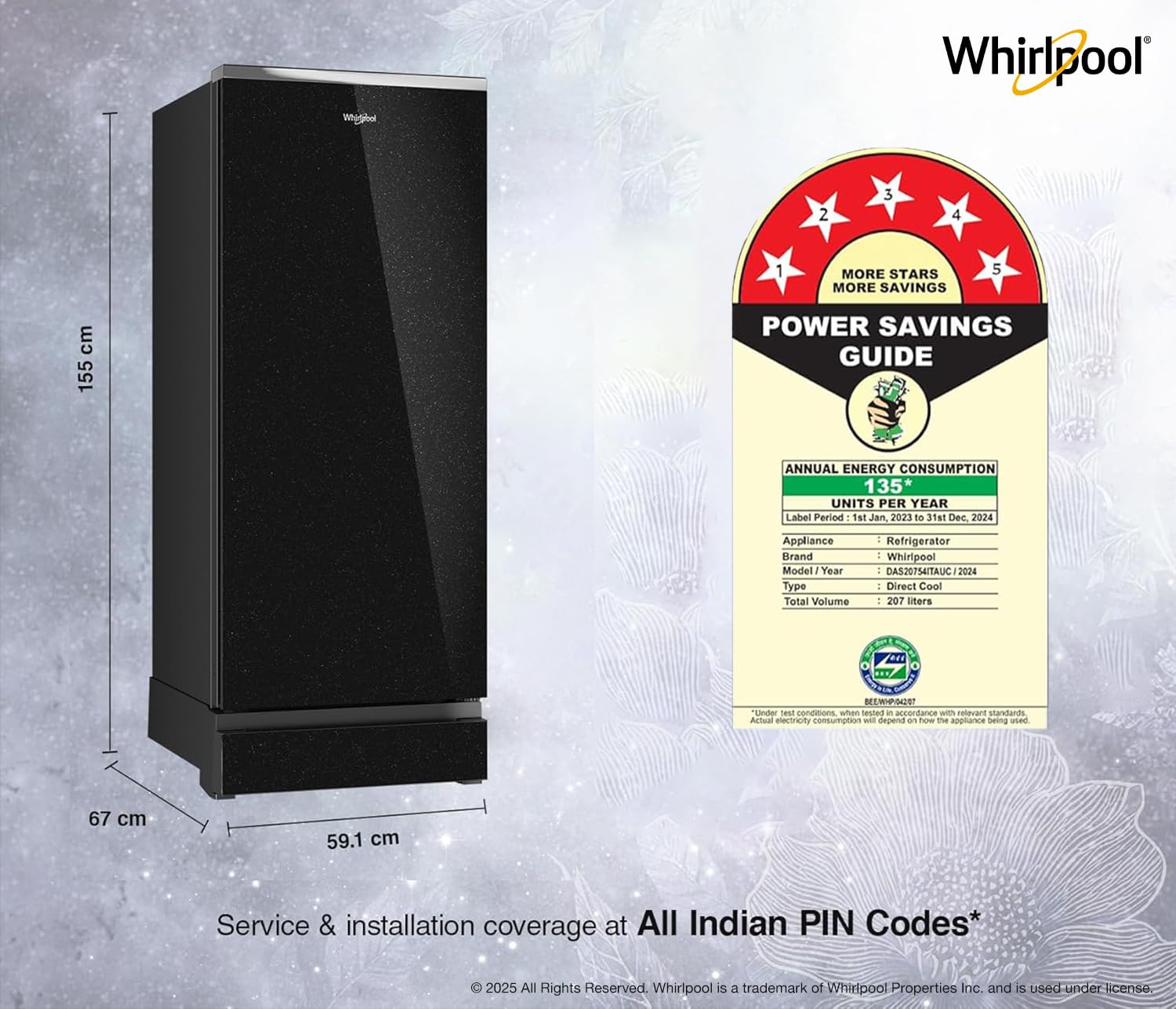 Whirlpool 207 L 5 Star Icemagic Pro Inverter Glass Door Direct-Cool Single Door Refrigerator (230 IMPRO GD ROY 5S Inv CRYSTAL BLACK, Base Stand with Drawer)