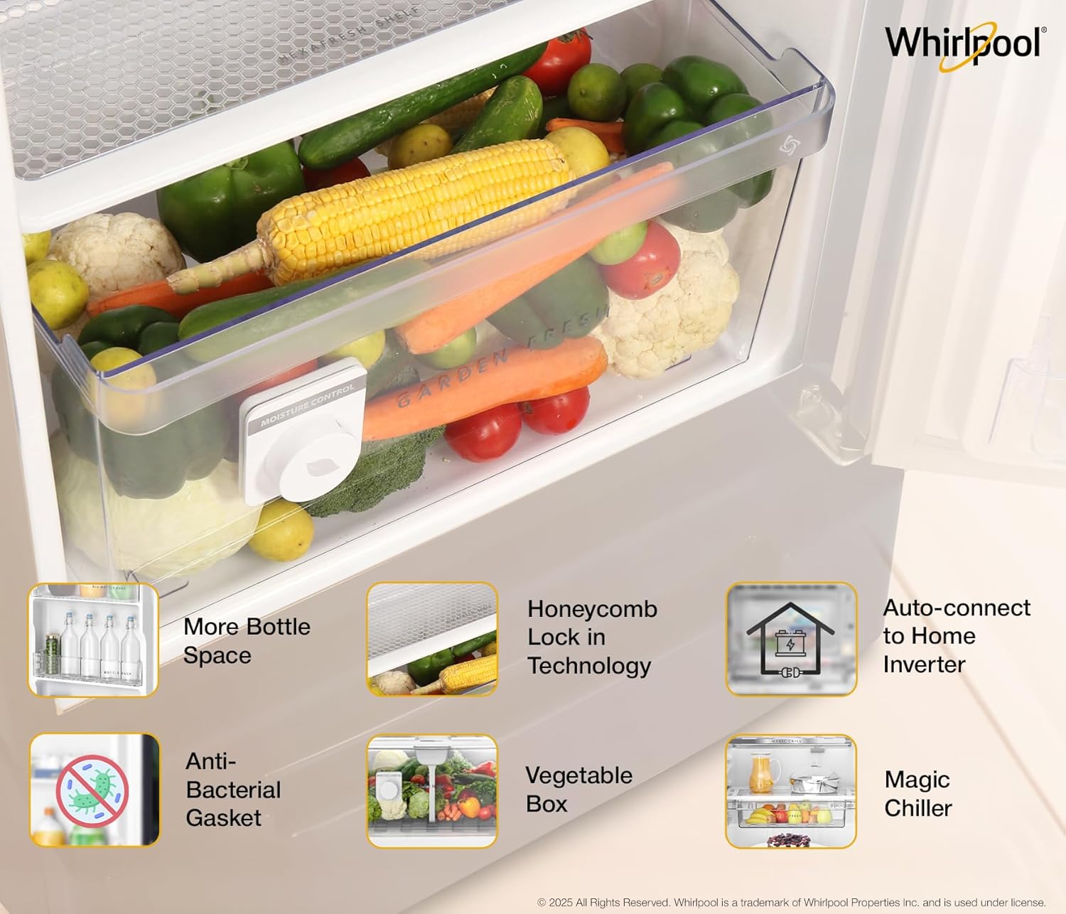 Vegetable Crisper with Honey Comb Moisture Lock-in Technology maintains optimum moisture in your vegetables and keeps them fresher for longer.