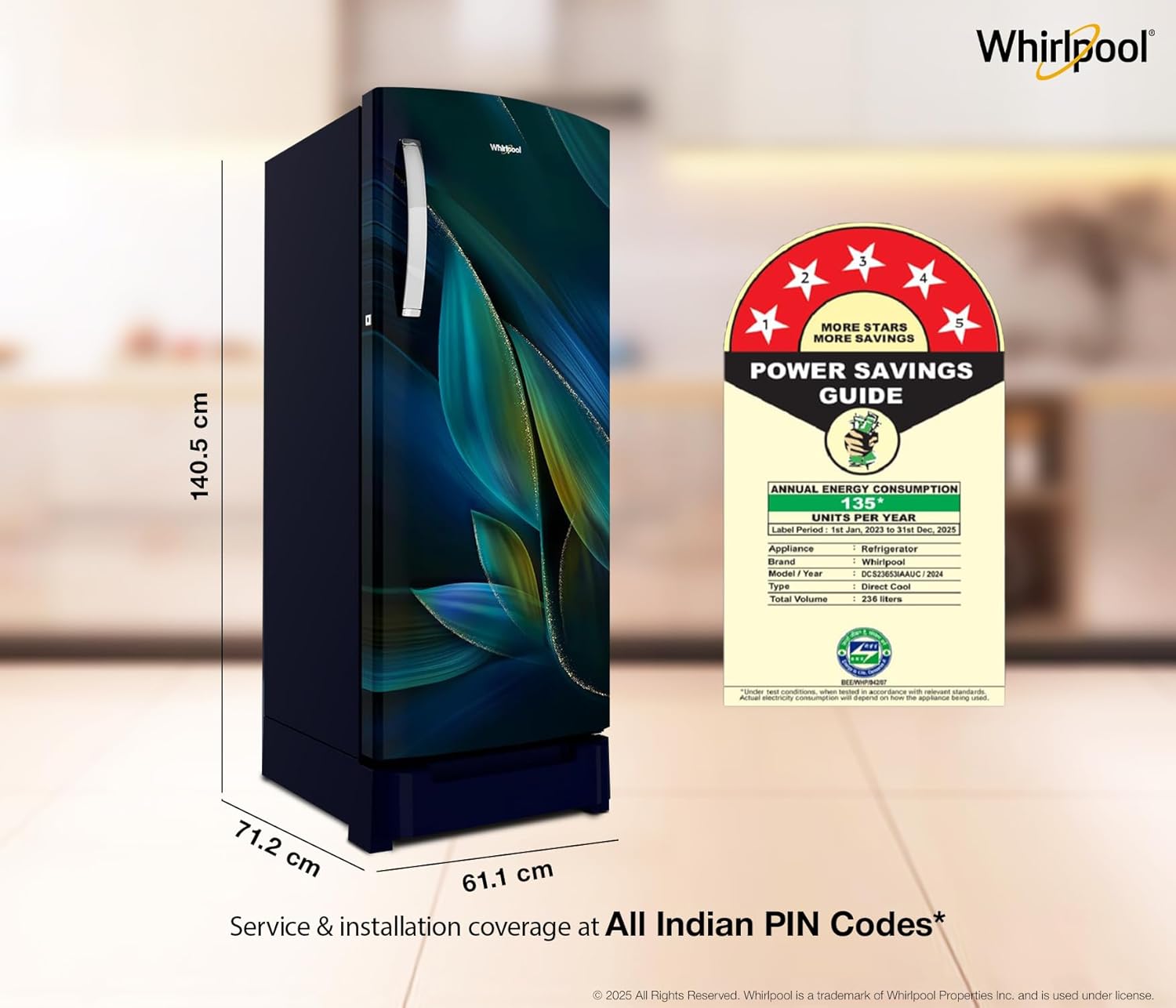 Energy Rating 5 Star: Best in class efficiency | Annual Energy consumption – 135* Units Per Year (Please refer BEE label for more information), Model/Year : DCS23653IAAUC/2024.