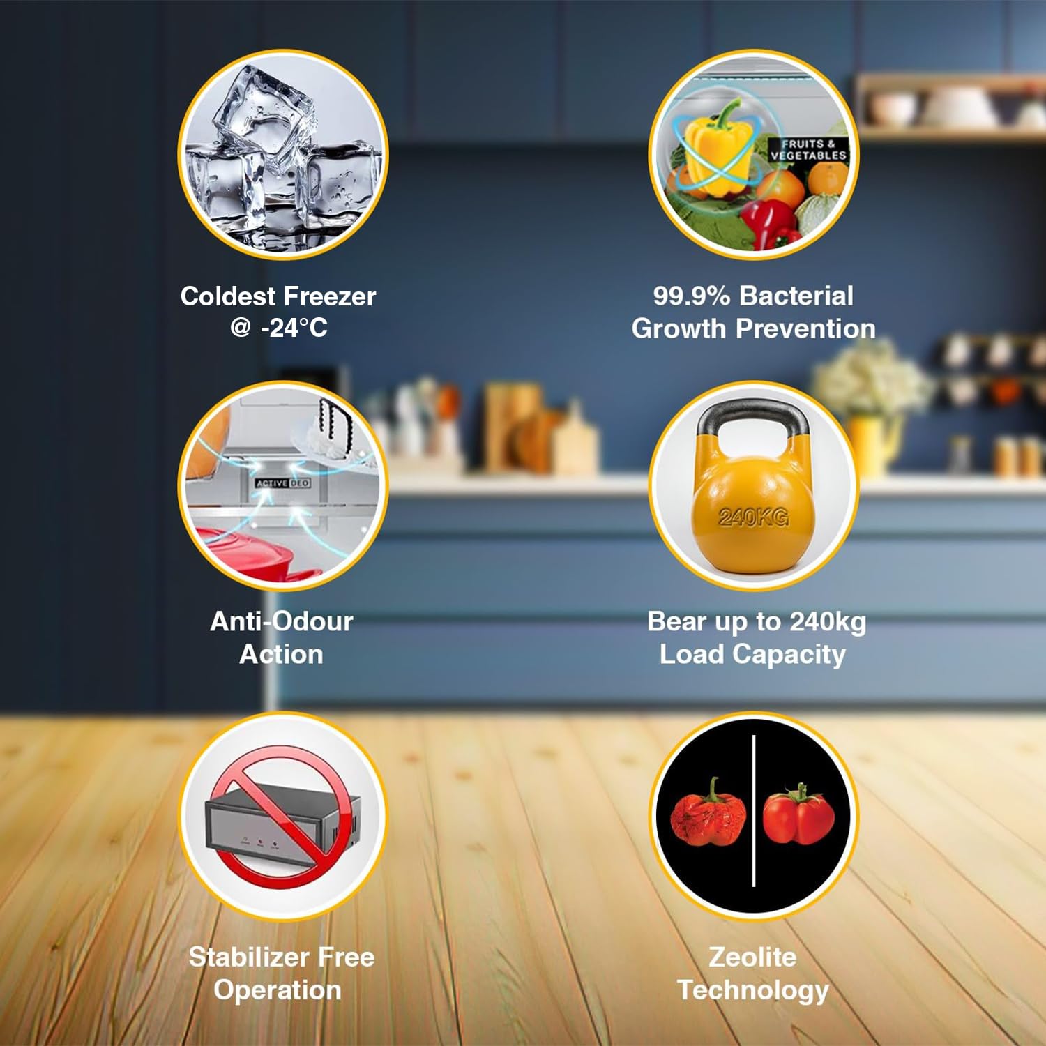Special Features: Touch UI Inside Refrigerator, Get Ice In Up 85 Minutes, 40% Faster Bottle Cooling, Anti-Odour Action, Coldest Freezer As -24C, 99.9% Bacterial Growth Prevention
