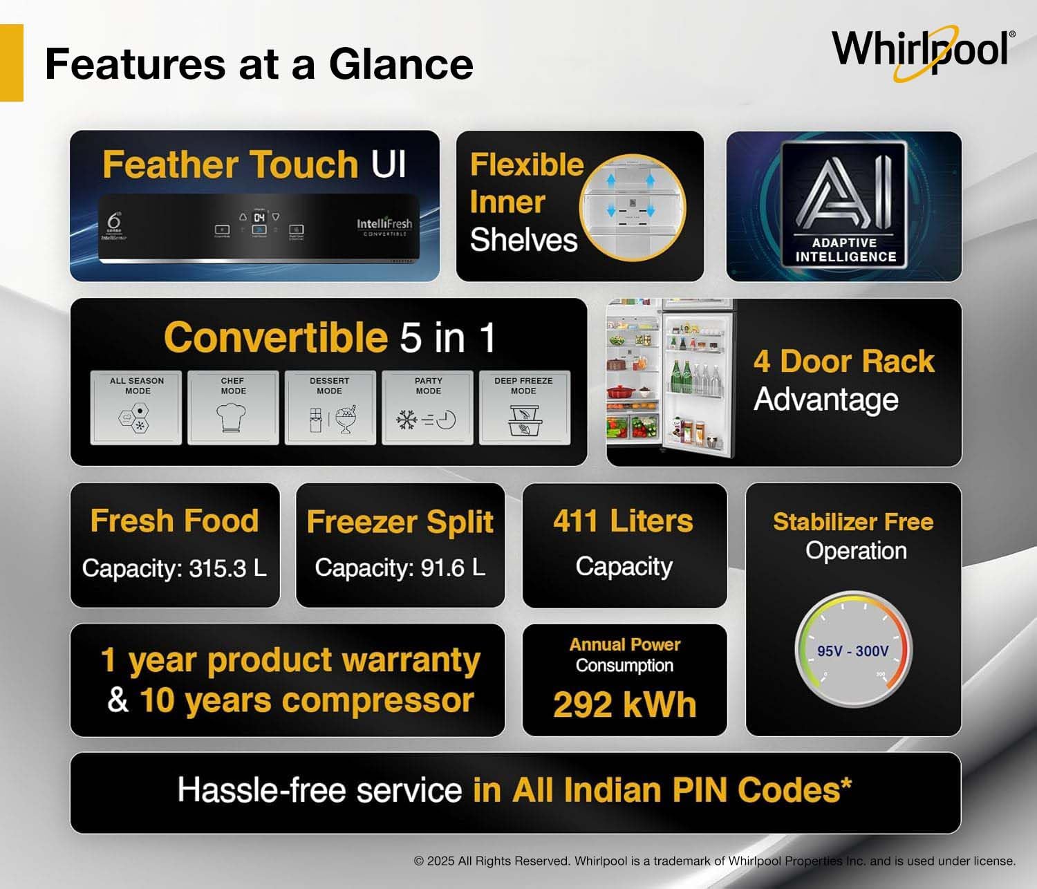 Experience the future of freshness with Whirlpool Intellifresh Range of Convertible refrigerators, powered by Adaptive Intelligence, keeping your food fresh for longer. Revolutionize your kitchen with cutting-edge technology and unmatched capacity!